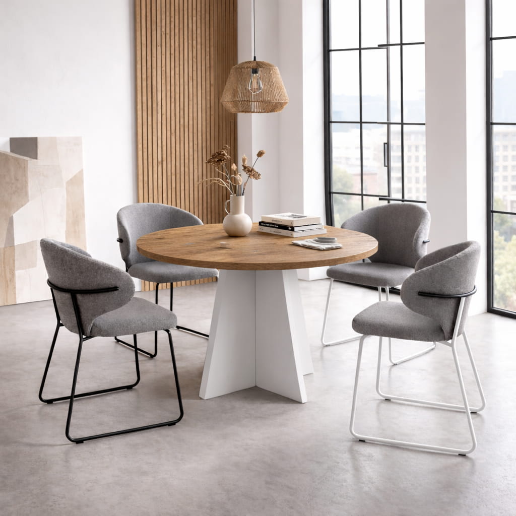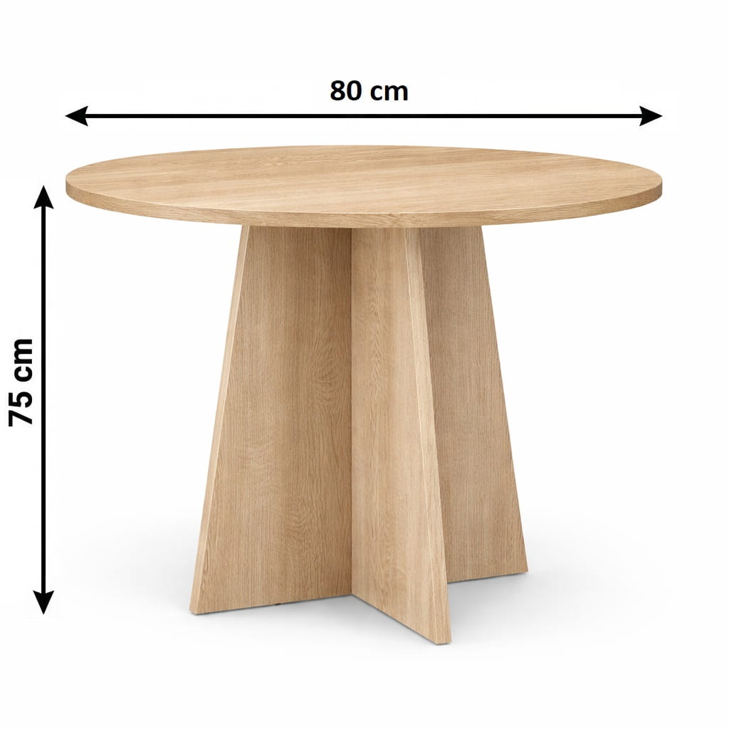 Średnica 80 cm zapewnia wygodną powierzchnię użytkową, która pozwala komfortowo korzystać ze stołu podczas codziennych posiłków, spotkań przy kawie lub pracy przy laptopie. Brak ostrych krawędzi sprawia, że okrągły stół 80 cm jest praktyczny i bezpieczny w codziennym użytkowaniu.
