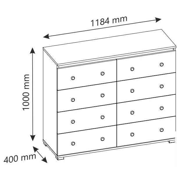 Komoda z szufladami 119 cm została wyposażona w aż osiem pojemnych szuflad, które zapewniają ogromną przestrzeń do przechowywania ubrań, tekstyliów, dokumentów czy akcesoriów. To idealne rozwiązanie dla osób, które potrzebują dużej ilości miejsca i chcą zachować porządek w swoim wnętrzu.