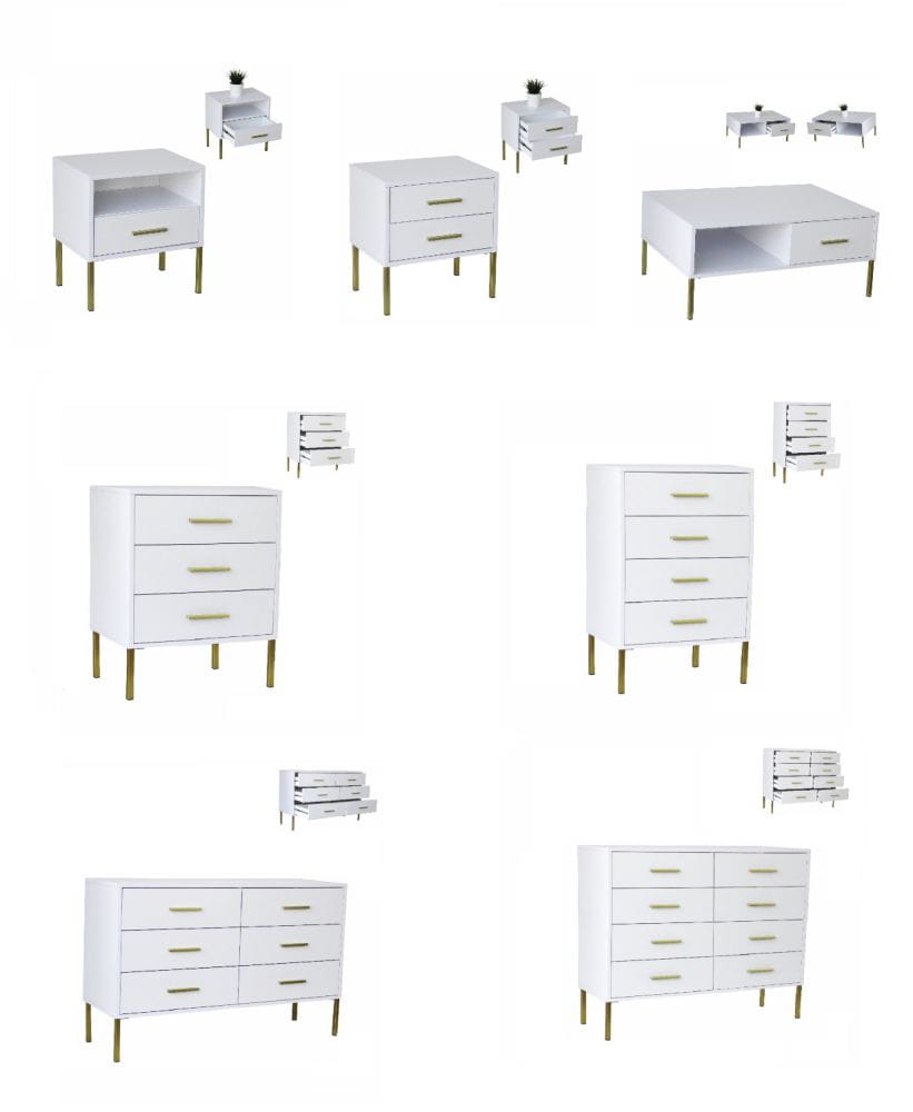 Komoda wyróżnia się nowoczesnym wyglądem oraz możliwością wyboru wykończenia detali. Dostępne warianty pozwalają dopasować charakter mebla do własnych preferencji: aluminium, czarny lub złoty akcent nadają komodzie unikalny styl.