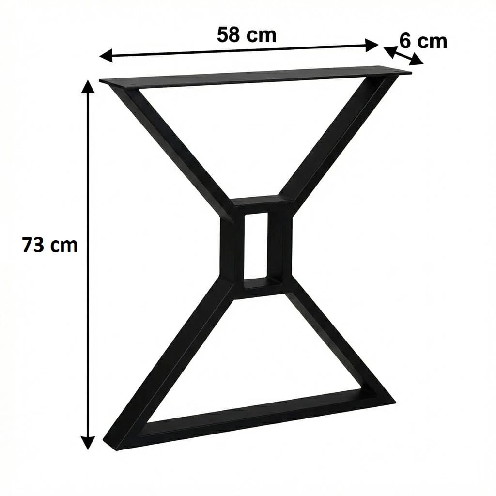 Nogi metalowe X do stołu wykonane zostały z wytrzymałych profili stalowych o wymiarach 6 × 2 cm. Konstrukcja została wzmocniona górnym płaskownikiem o wymiarach 8 × 0,4 cm, który umożliwia stabilne przymocowanie blatu oraz zwiększa wytrzymałość całego stelaża.