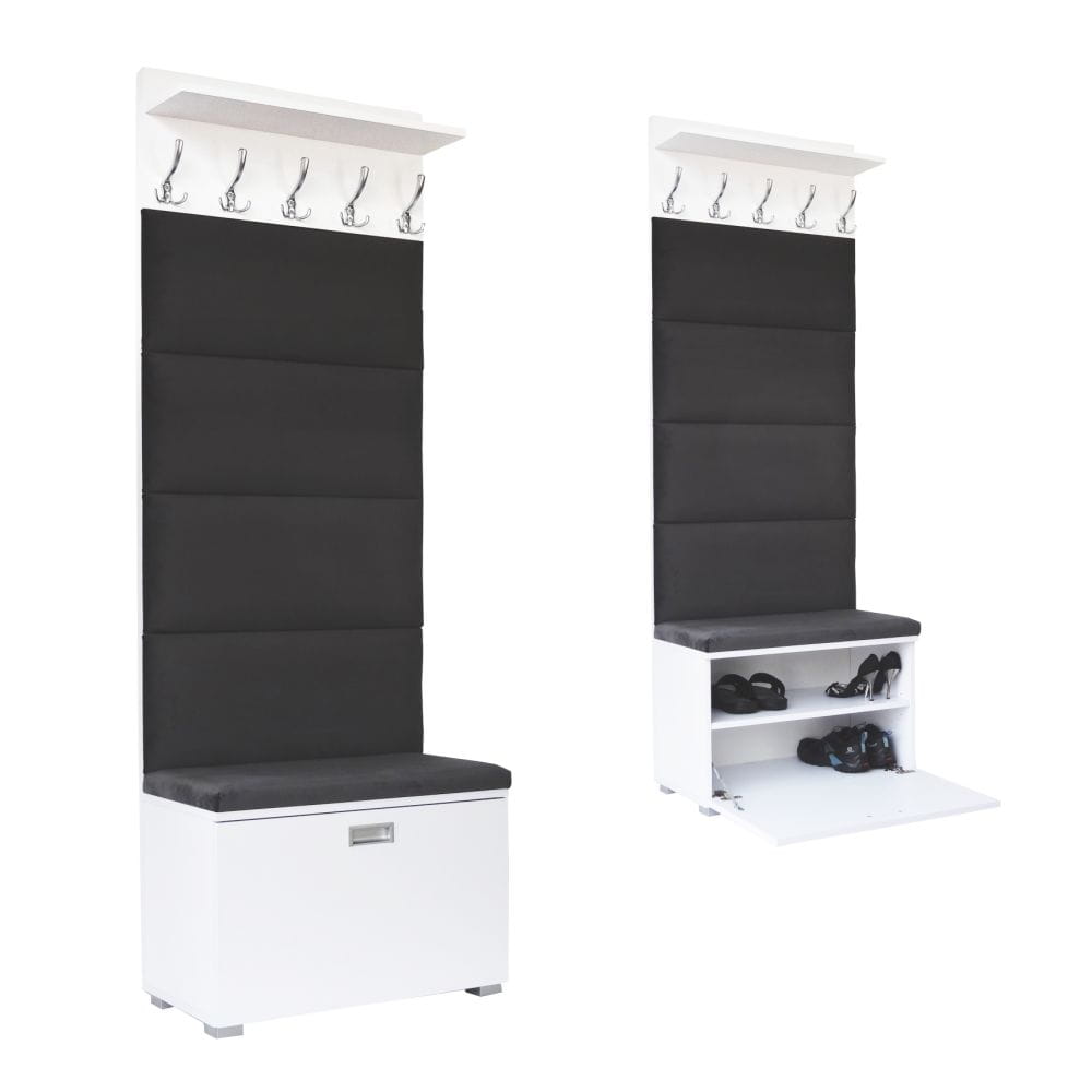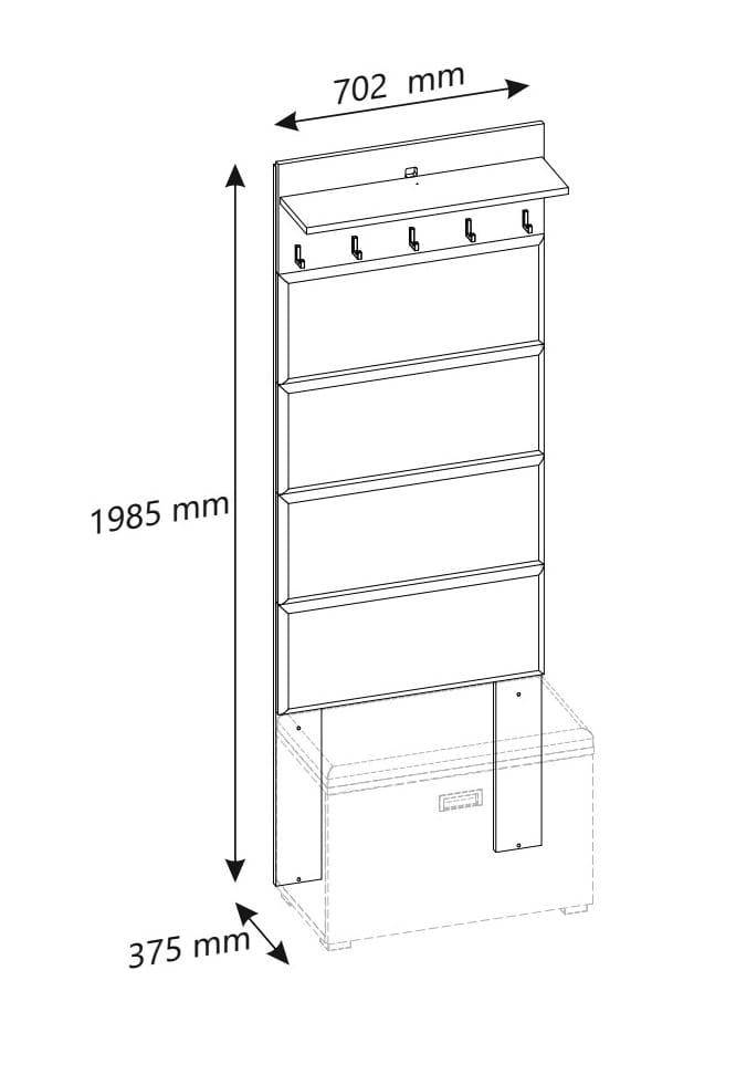 Zestaw składa się z szafki na buty z wygodnym siedziskiem, paneli ściennych oraz wieszaka na ubrania. Dzięki temu przedpokój 70 cm stanowi praktyczne rozwiązanie do codziennego użytkowania w domu lub mieszkaniu.