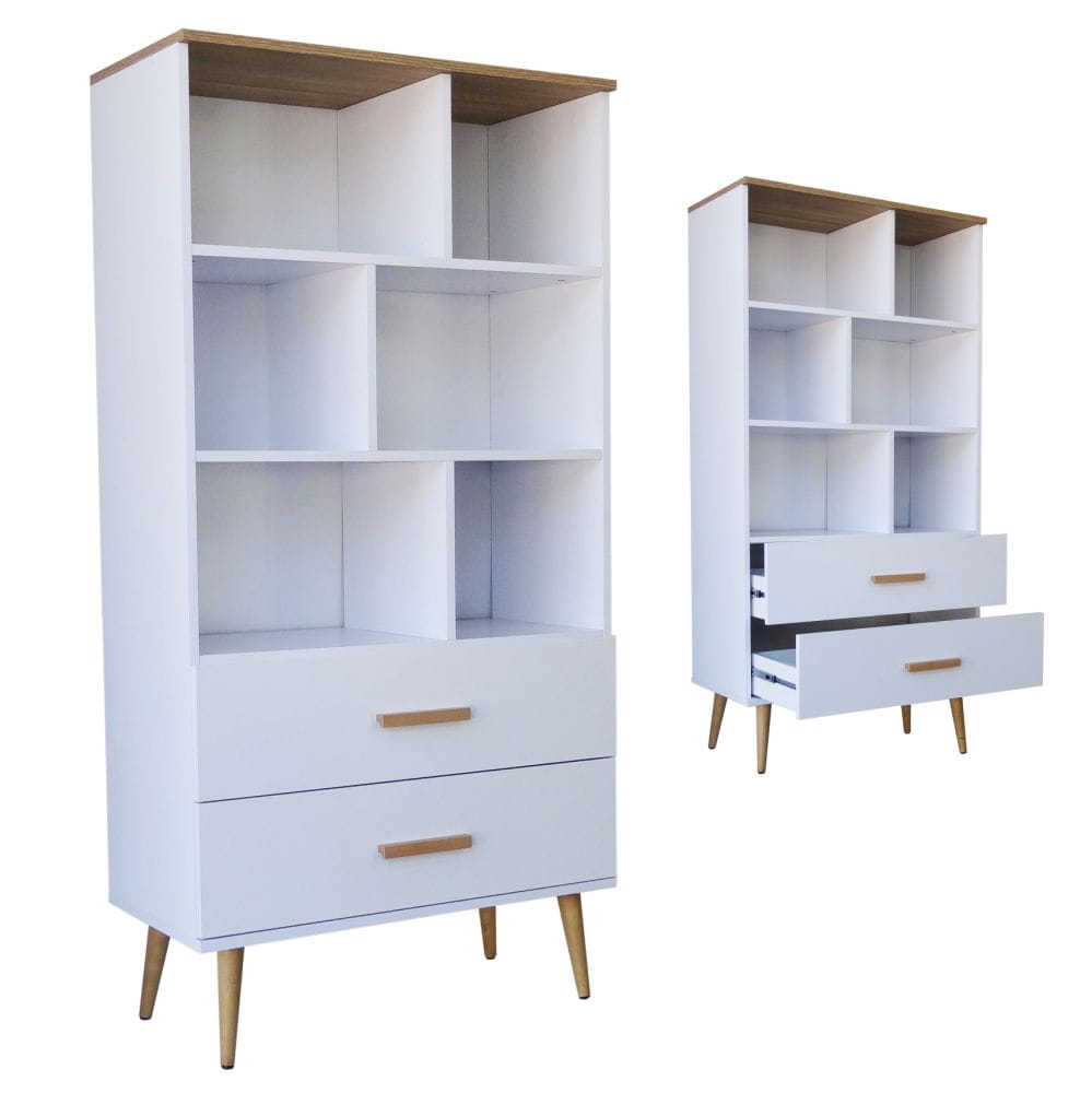 Regał w stylu skandynawskim o szerokości 85cm przeznaczony dla osób, które cenią sobie wygodę i elegancję. Świetnie będzie komponować się z wystrojem salonu. Posiada dwie pojemne szuflady. Regał wykonany z płyty laminowanej o grubości 18mm oraz nóg z drewna.