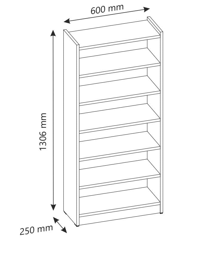 Regał 7 poziomowy o szerokości 60 cm. Wykonany jest z płyty laminowanej o grubości 18mm. Obrzeża oklejane są okleiną PCV.