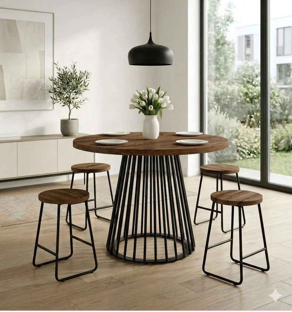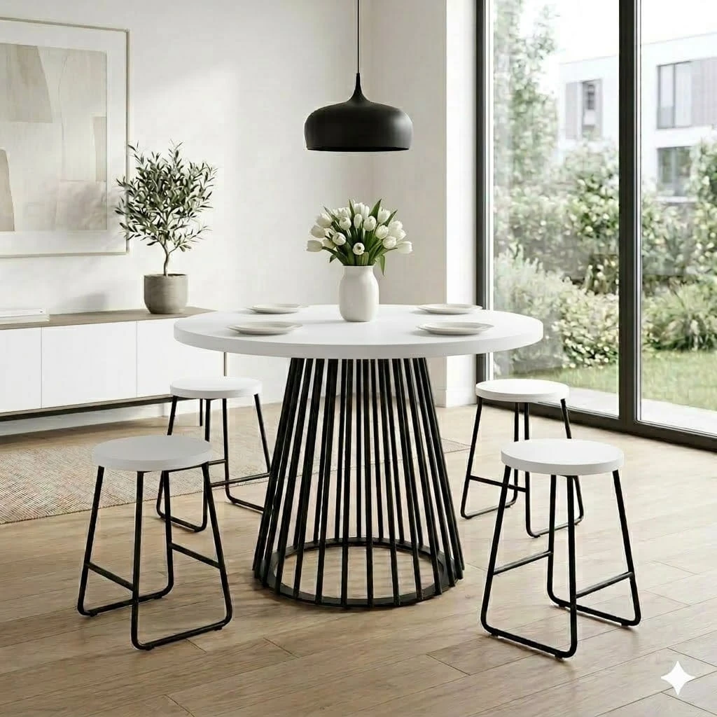 Dzięki połączeniu minimalistycznego blatu oraz efektownej metalowej podstawy nowoczesny stół okrągły do kuchni staje się zarówno praktycznym meblem, jak i dekoracyjnym elementem wnętrza.