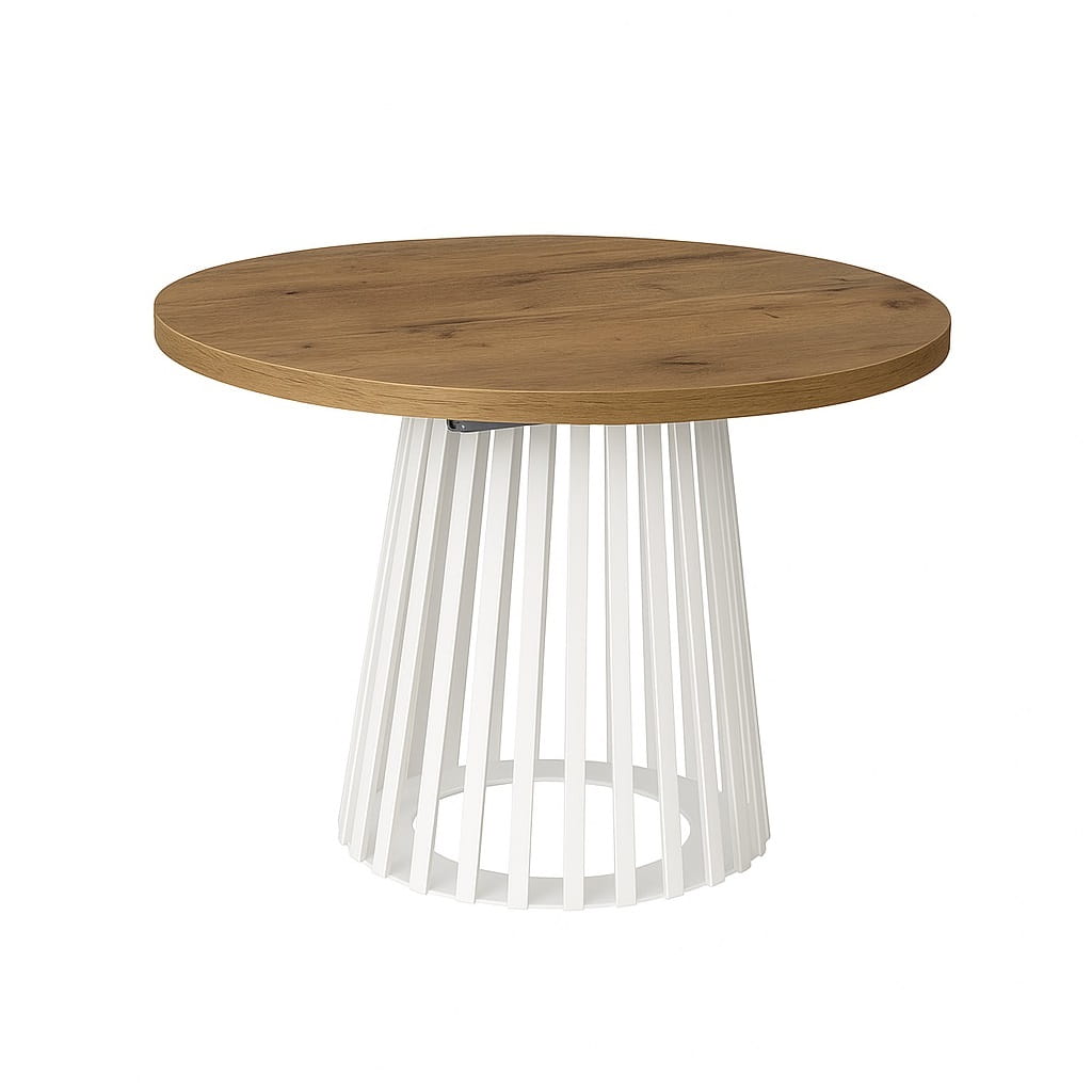 Wyjątkowym elementem stołu jest designerska podstawa wykonana z metalu, której konstrukcja nawiązuje do dekoracyjnych lameli. Dzięki temu stół okrągły z metalową podstawą lamele wyróżnia się nowoczesnym wyglądem i stanowi efektowny element wystroju wnętrza.
