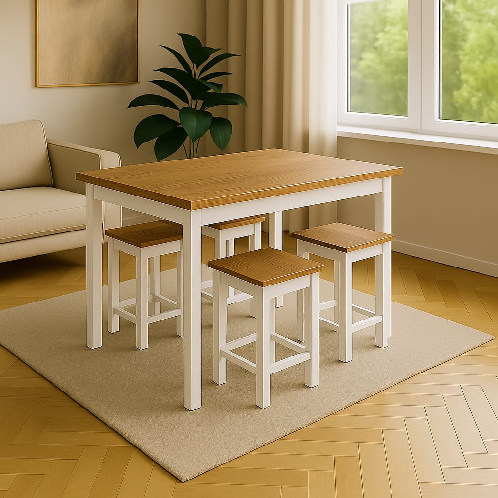 Dzięki wymiarom 60x100 cm model świetnie odnajduje się w niewielkich przestrzeniach. Jako mały stół 60x100 do mieszkania w bloku może być ustawiony przy ścianie lub centralnie w pomieszczeniu, w zależności od aranżacji. Odległość między nogami (ok. 450 mm szerokości oraz 850 mm długości) zapewnia komfortowe ustawienie krzeseł i swobodę użytkowania.