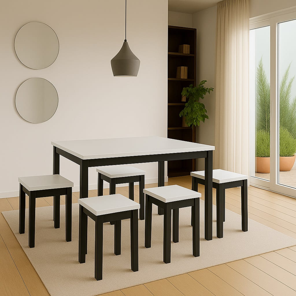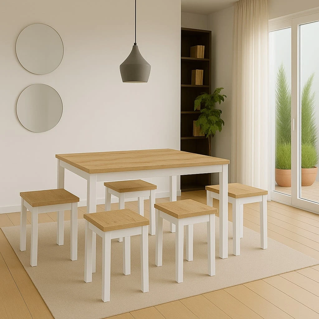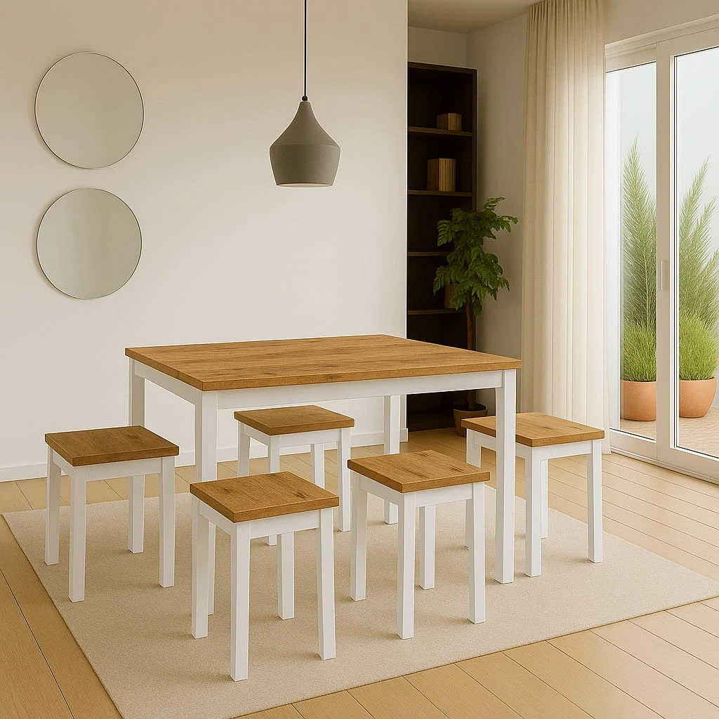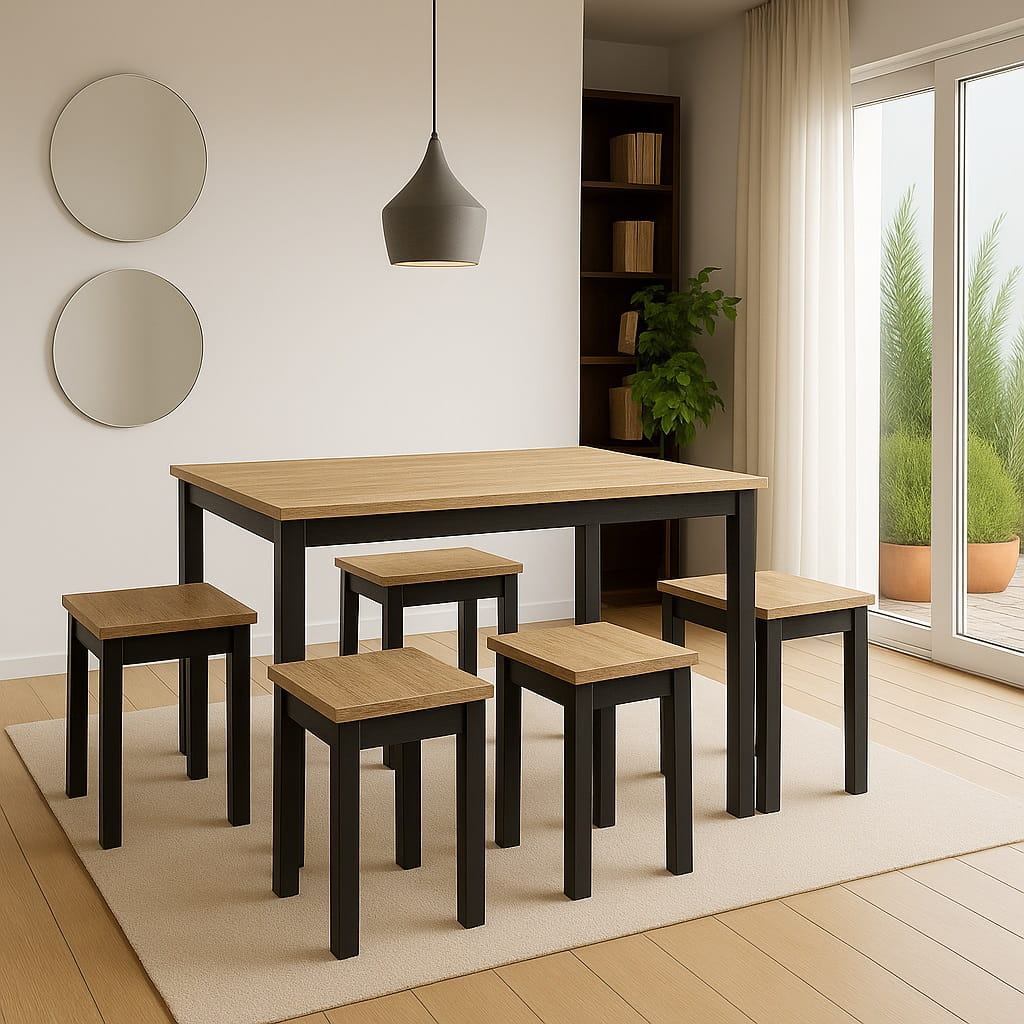 Wąska głębokość 60 cm sprawia, że model doskonale odnajduje się nawet w mniejszych pomieszczeniach. Jednocześnie długość 120 cm pozwala komfortowo ustawić cztery krzesła bez ograniczania przestrzeni użytkowej. Stół prostokątny 60x120 z metalowymi nogami łączy ergonomię z estetyką – może stać przy ścianie, w aneksie kuchennym lub centralnie w jadalni. To funkcjonalny wąski stół industrialny, który nie przytłacza wnętrza, a jednocześnie nadaje mu wyrazistego charakteru.