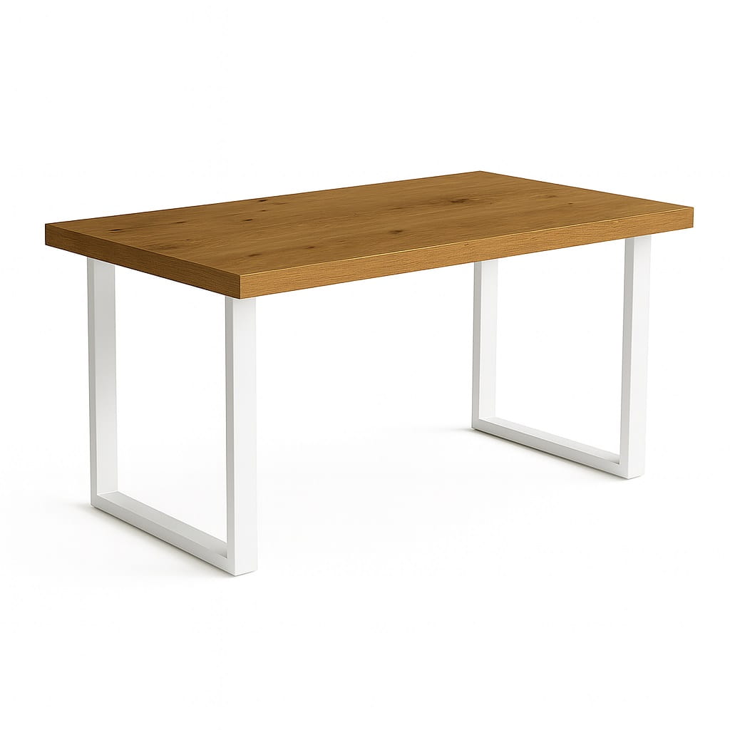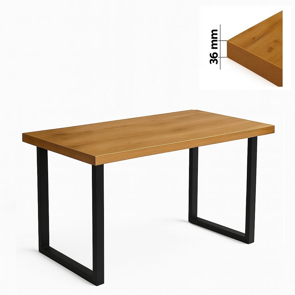Blat wykonany z płyty laminowanej o grubości 36 mm gwarantuje trwałość oraz podwyższoną odporność na zarysowania. Dzięki temu stół prostokątny z metalowymi nogami doskonale sprawdza się w codziennym użytkowaniu – zarówno w domu, jak i w przestrzeniach użytkowych. Krawędzie zabezpieczone okleiną PCV o grubości 1,0 mm chronią mebel przed uszkodzeniami mechanicznymi i zwiększają jego żywotność. Konstrukcję stabilizuje stół z metalowym stelażem U, malowany proszkowo, co zapewnia odporność na zarysowania i estetyczne wykończenie. To połączenie solidności i nowoczesnego designu, które daje pewność stabilności na lata.