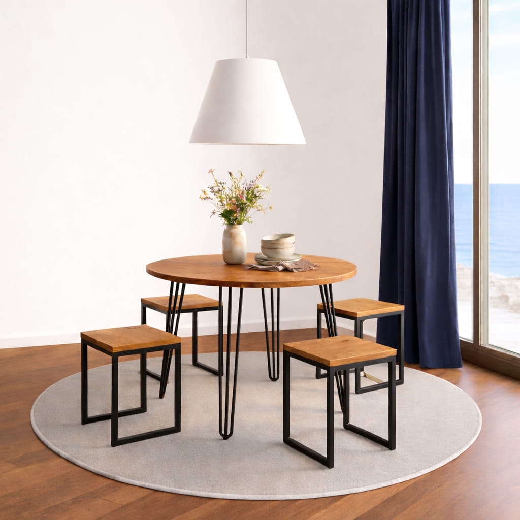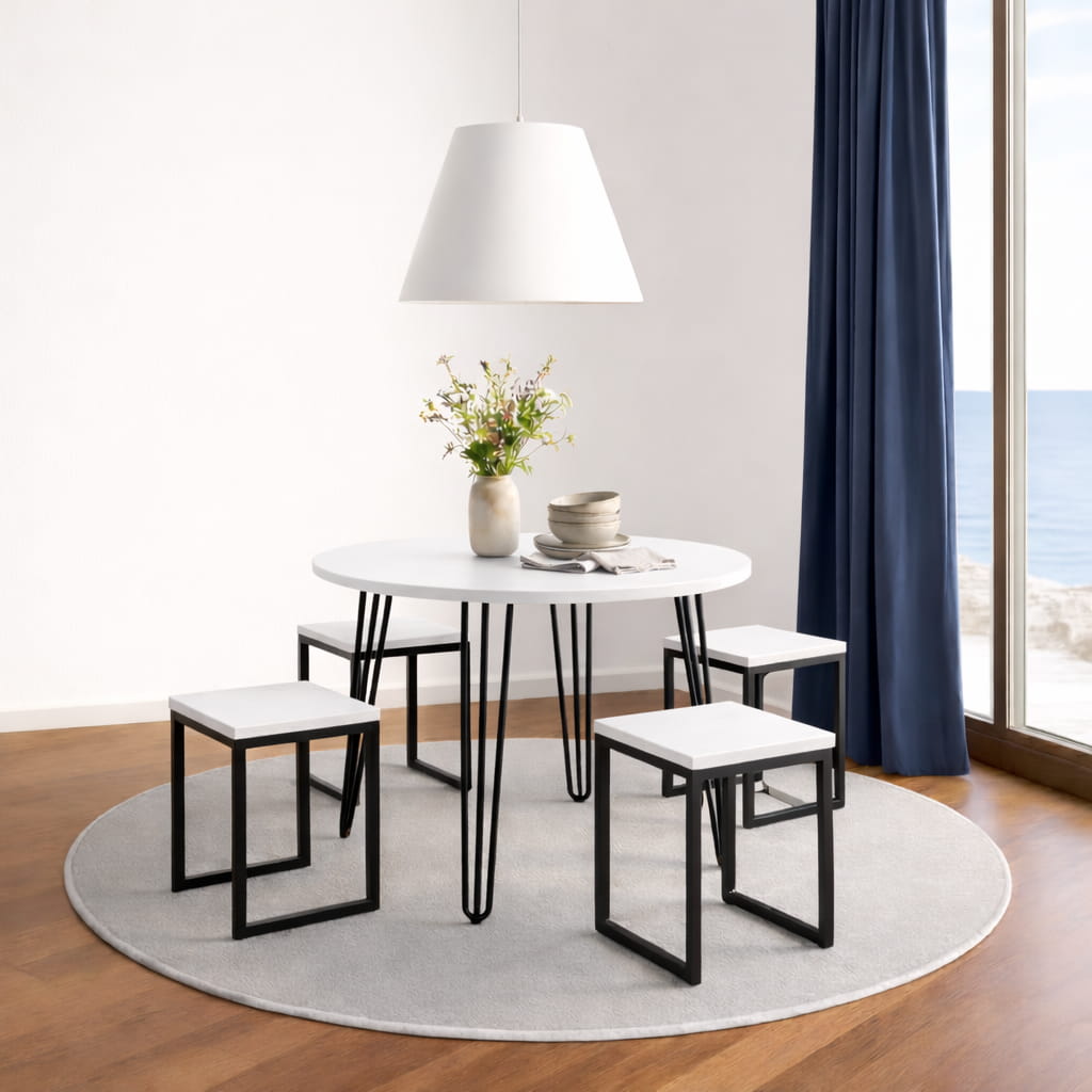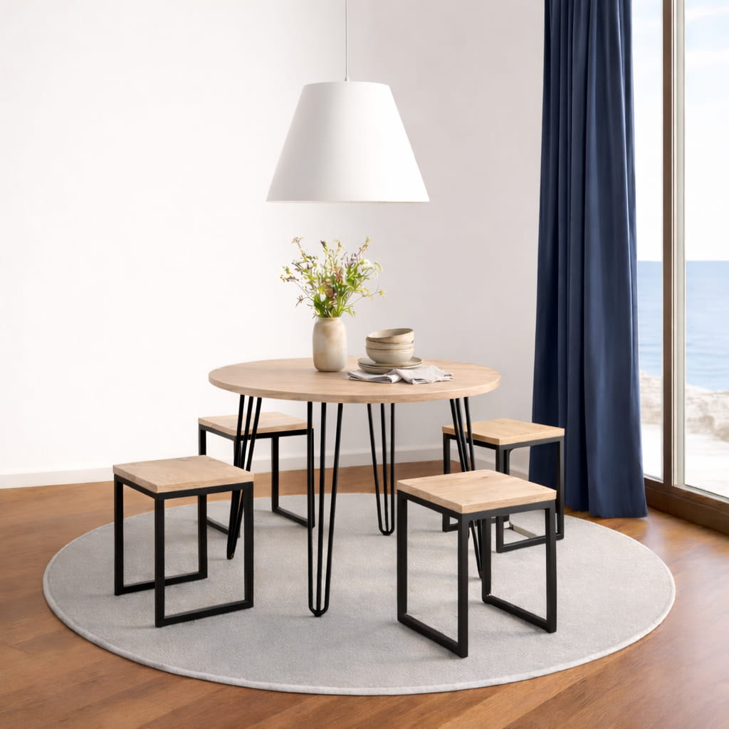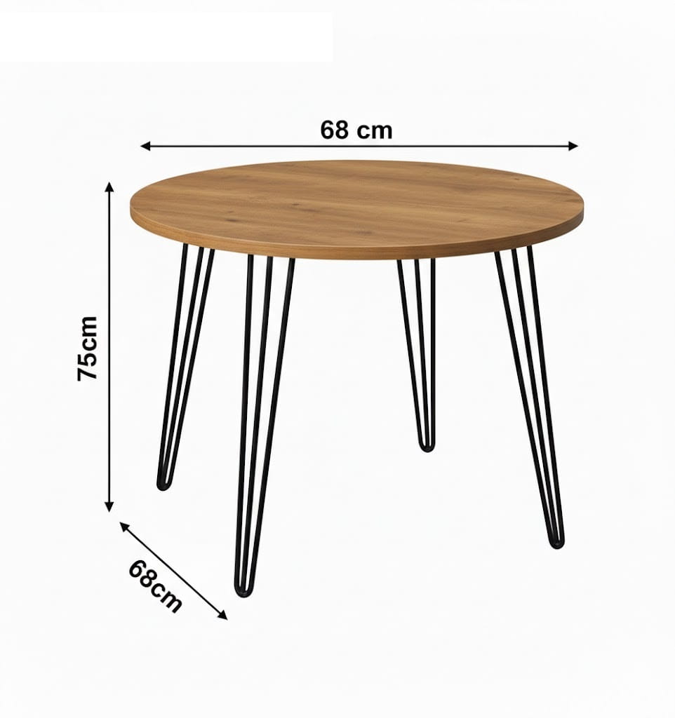 Ten stół okrągły 68 cm hairpin inspirowany jest stylem mid-century modern oraz skandynawską prostotą. Smukłe nogi hairpin legs, pochylone pod kątem około 7–8 stopni, nadają konstrukcji lekkości i subtelnej dynamiki. Okrągła forma blatu sprawia, że przestrzeń wydaje się bardziej otwarta i przyjazna, co ma ogromne znaczenie w mniejszych pomieszczeniach. Model doskonale sprawdzi się jako mały stół okrągły do kuchni lub praktyczny okrągły stół do kawalerki. To także świetny wybór jako kompaktowy stół do małego salonu, przy którym wygodnie napijesz się kawy, zjesz posiłek lub popracujesz przy laptopie. Minimalistyczna forma sprawia, że mebel łatwo dopasować do różnych aranżacji – od loftowych po klasyczne.