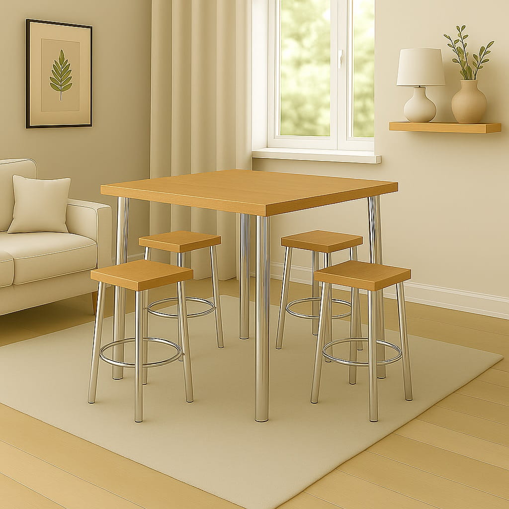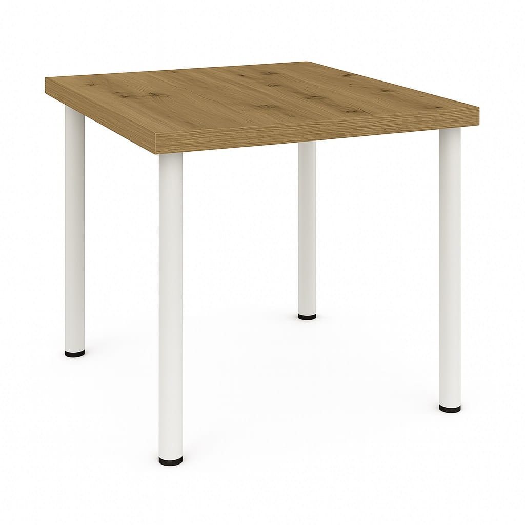 Dzięki proporcjom 80x80 cm model może pełnić rolę centralnego punktu strefy jadalnianej lub zostać ustawiony bliżej ściany – w zależności od układu pomieszczenia. Jako mały stół kwadratowy do mieszkania w bloku pozwala optymalnie wykorzystać przestrzeń, zachowując komfort użytkowania. Rozstaw nóg (ok. 650 mm) umożliwia swobodne ustawienie krzeseł.