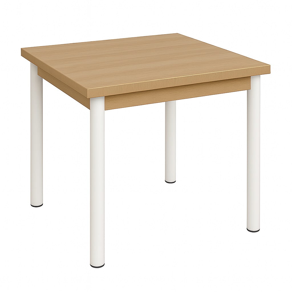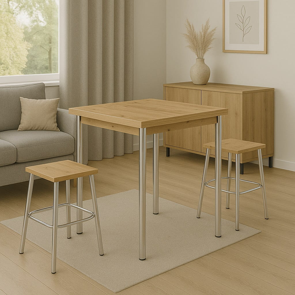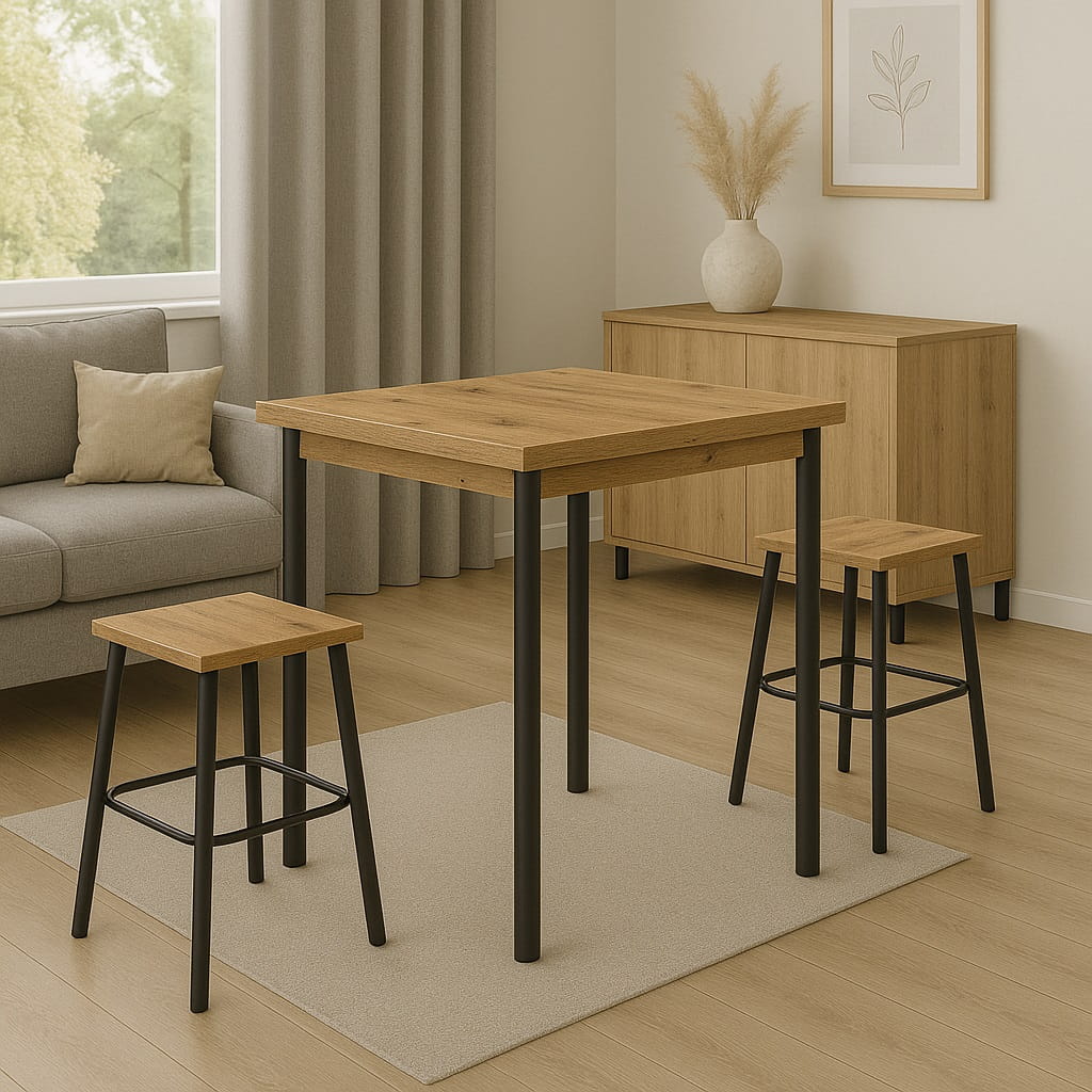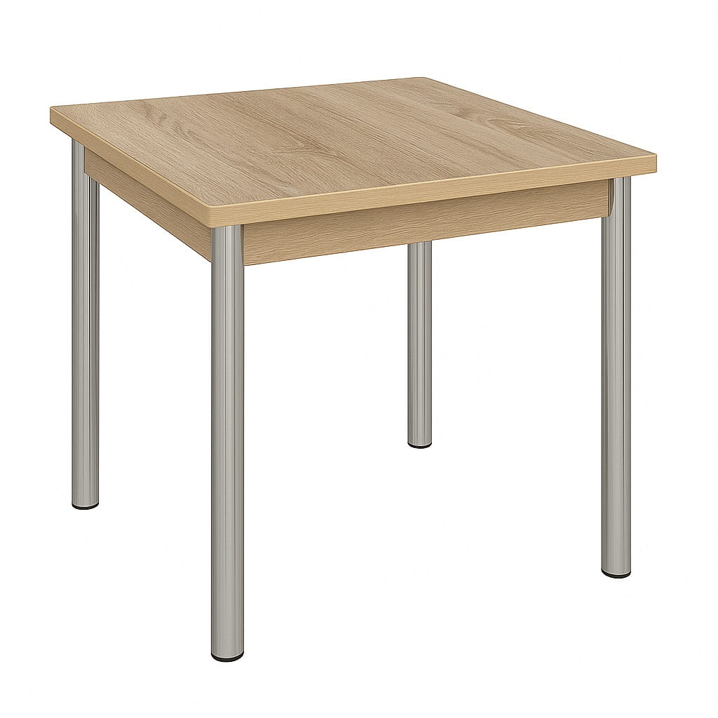 Dzięki wymiarom 80x80 cm stół może zostać ustawiony zarówno centralnie, jak i bliżej ściany, co czyni go idealnym wyborem jako stół do mieszkania w bloku 80x80. Rozstaw nóg wynoszący około 650 mm zapewnia wygodną przestrzeń na krzesła i swobodę ruchu podczas użytkowania.