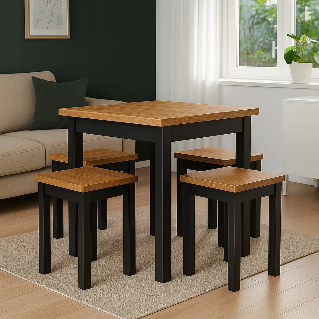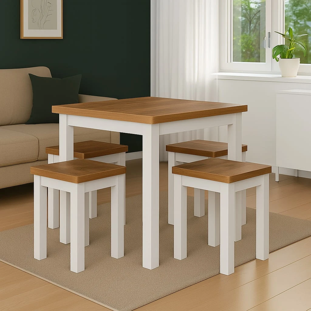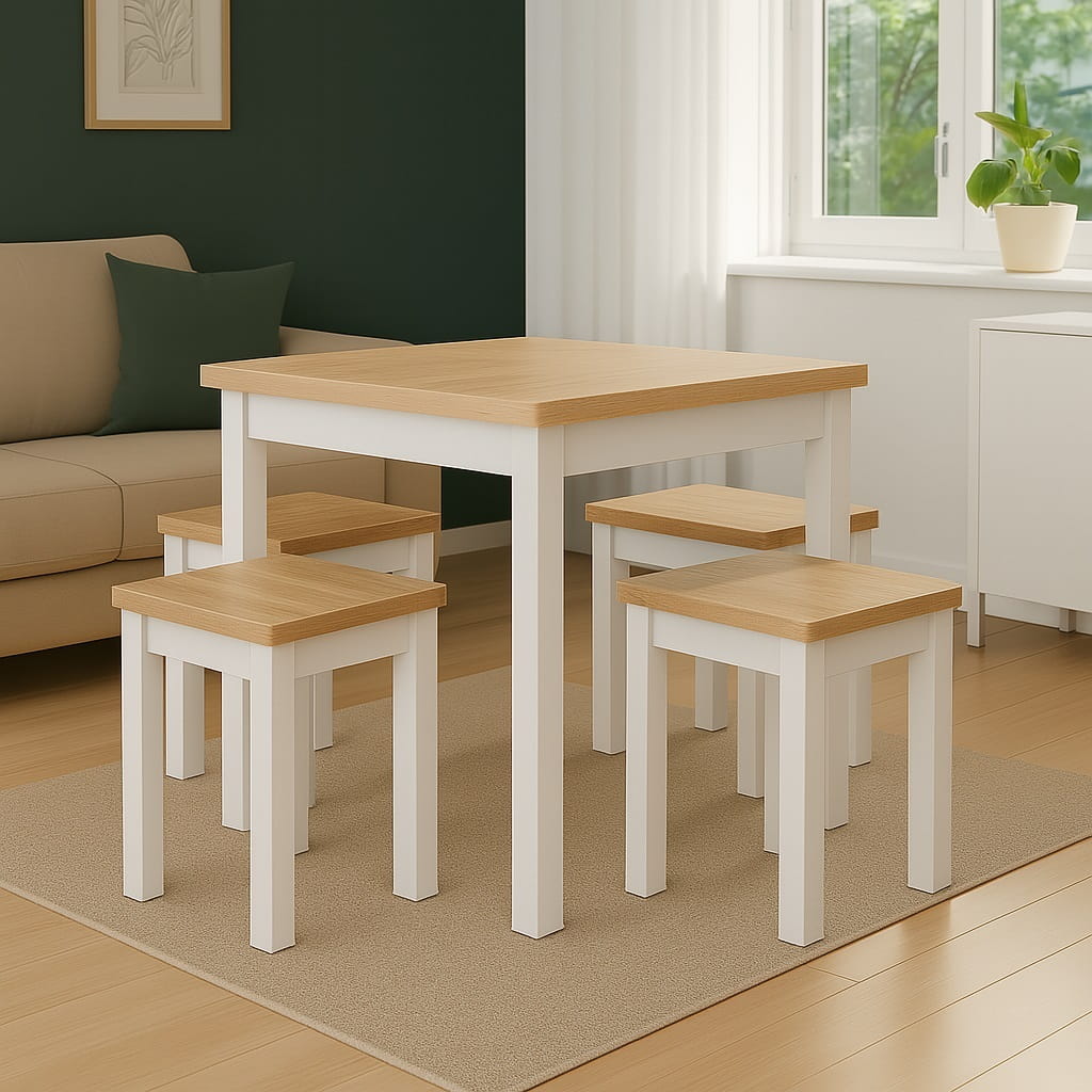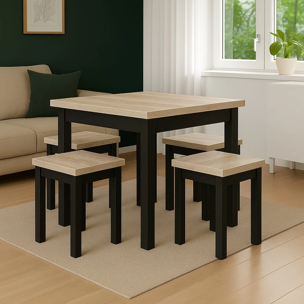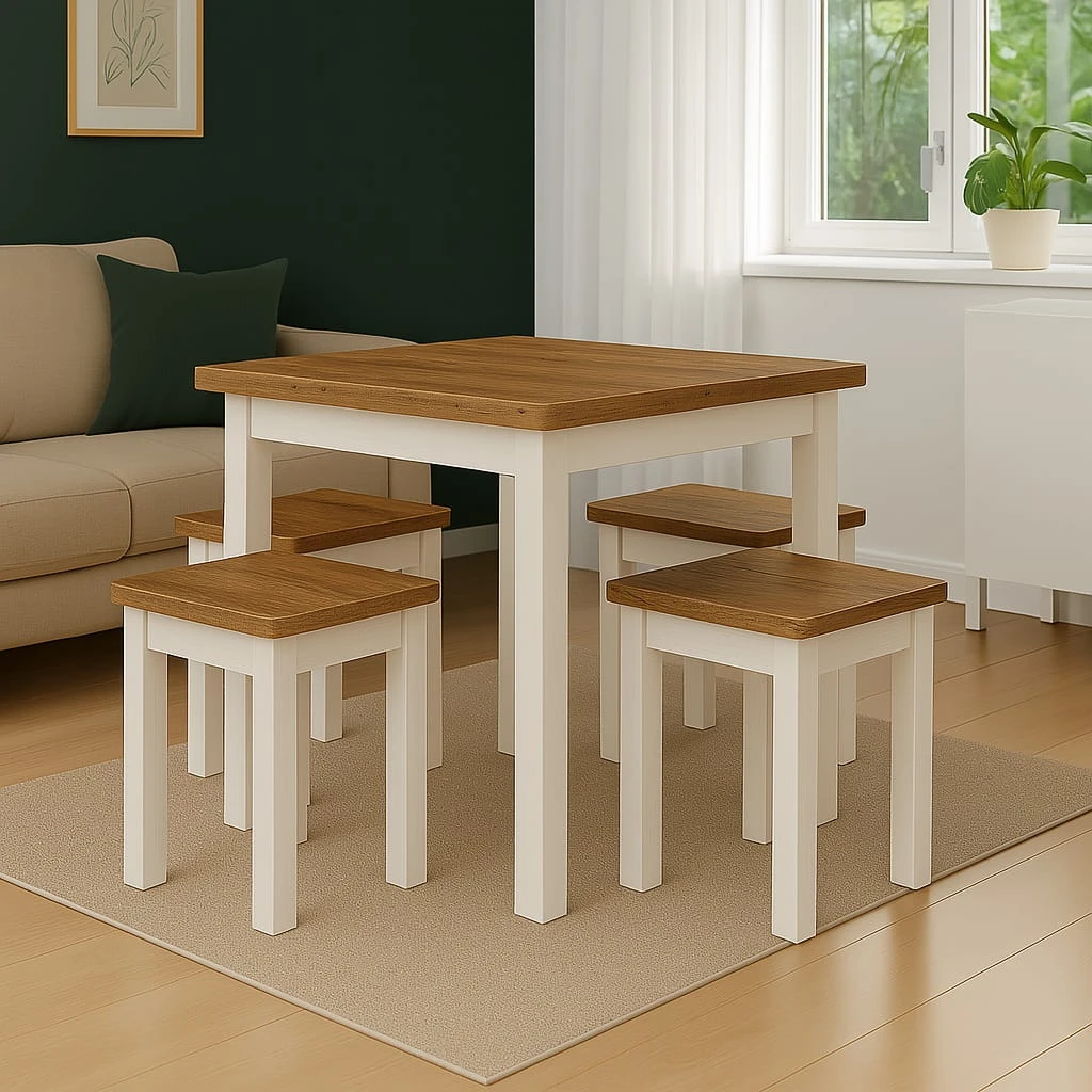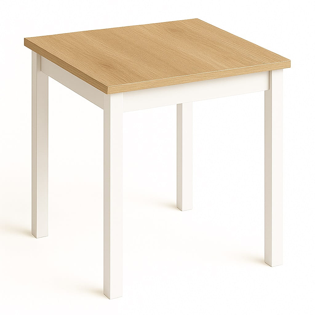 Proporcje 80x80 cm sprawiają, że model doskonale sprawdzi się jako stół 80x80 do małej jadalni lub aneksu kuchennego w mieszkaniu w bloku. Kwadratowy blat pozwala ustawić mebel centralnie lub przy ścianie, w zależności od układu pomieszczenia. Odległość między nogami wynosi około 650 mm, co zapewnia komfortowe ustawienie krzeseł i swobodę ruchów podczas użytkowania.