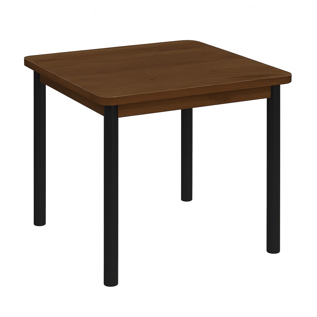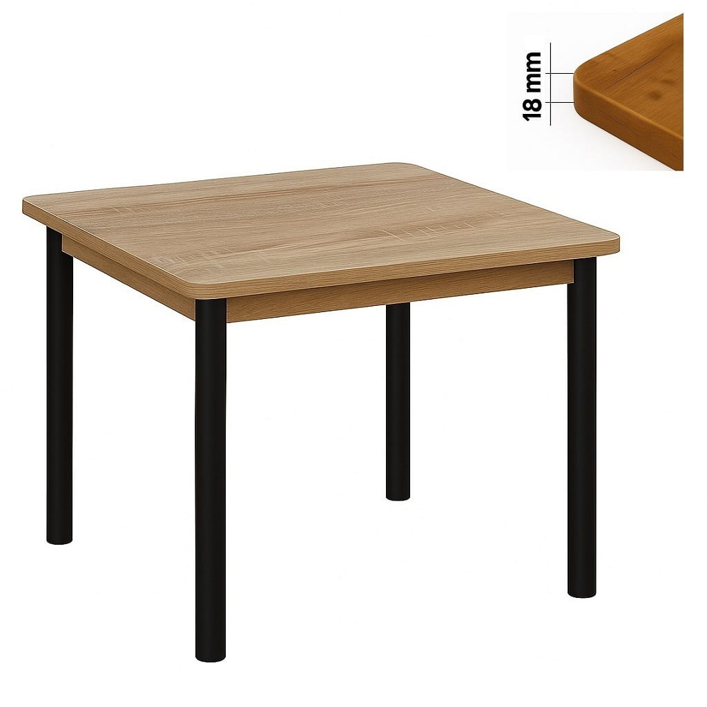 Dzięki delikatnie wyprofilowanym krawędziom stół 80x80 z zaokrąglonym blatem prezentuje się lżej i bardziej elegancko niż klasyczne modele do kantu. Blat o grubości 18 mm wykonany z trwałej płyty laminowanej cechuje się podwyższoną odpornością na zarysowania oraz codzienne użytkowanie.