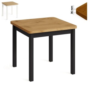 Stół 80x80 z grubym blatem 36 mm wykonany jest z laminowanej płyty o podwyższonej odporności na zarysowania. Grubość 3,6 cm nadaje meblowi masywny, stabilny wygląd oraz zwiększa jego trwałość w codziennym użytkowaniu.