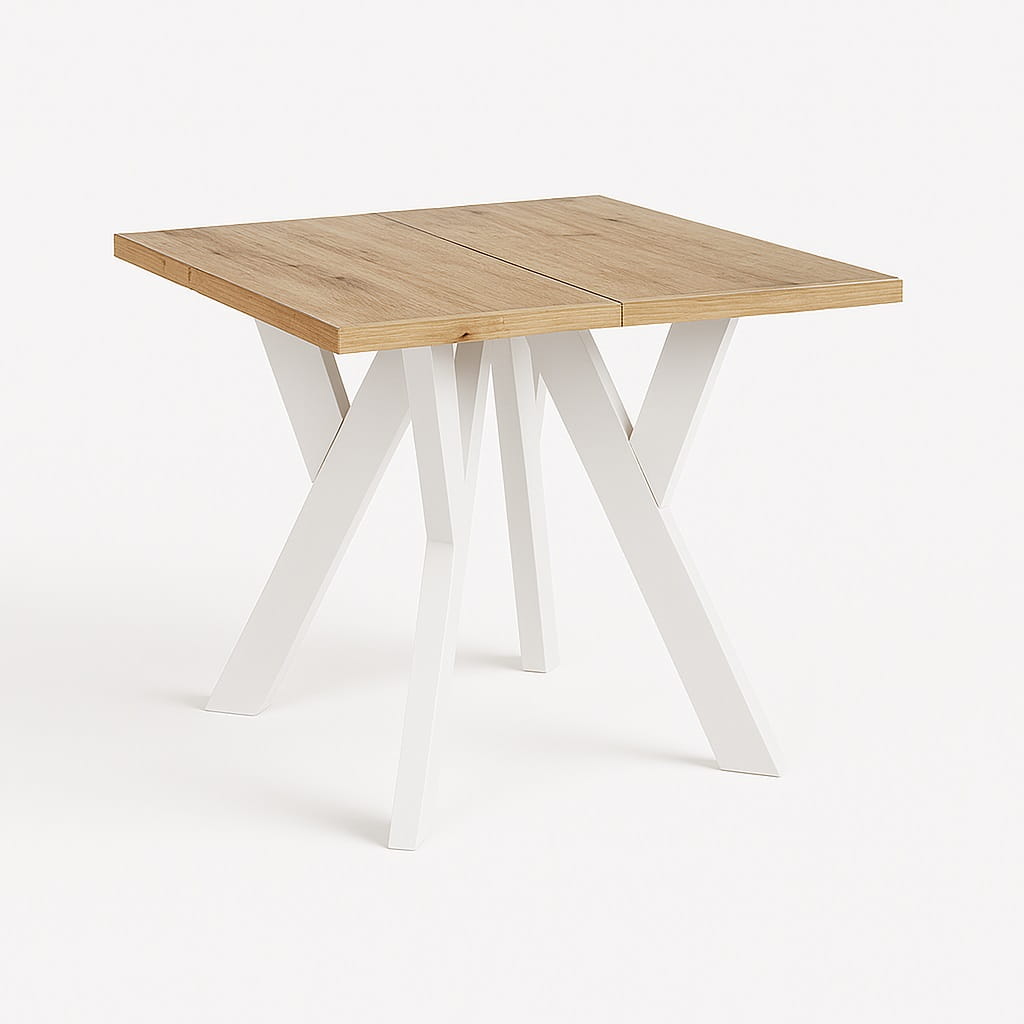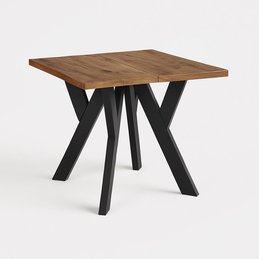 Stół 80x80/230 cm rozkładany to nowoczesna forma zamknięta w kompaktowym kwadracie, która w kilka chwil zamienia się w pełnowymiarowy stół rodzinny. Pogrubiony blat 3,6 cm oraz designerskie metalowe nogi typu Y tworzą wyrazisty, industrialny charakter mebla.