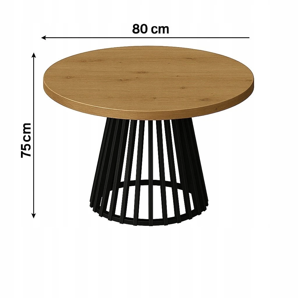 Praktyczny stół w stylu LOFT. Blat wykonany z płyty laminowanej o średnicy Ø 80cm i grubości 36mm. Masywna podstawa o średnicy 56cm wykonana jest z metalu przypominającą lamele w kolorze czarnym, malowana proszkowo zapewnia doskonałą stabilność stołu.