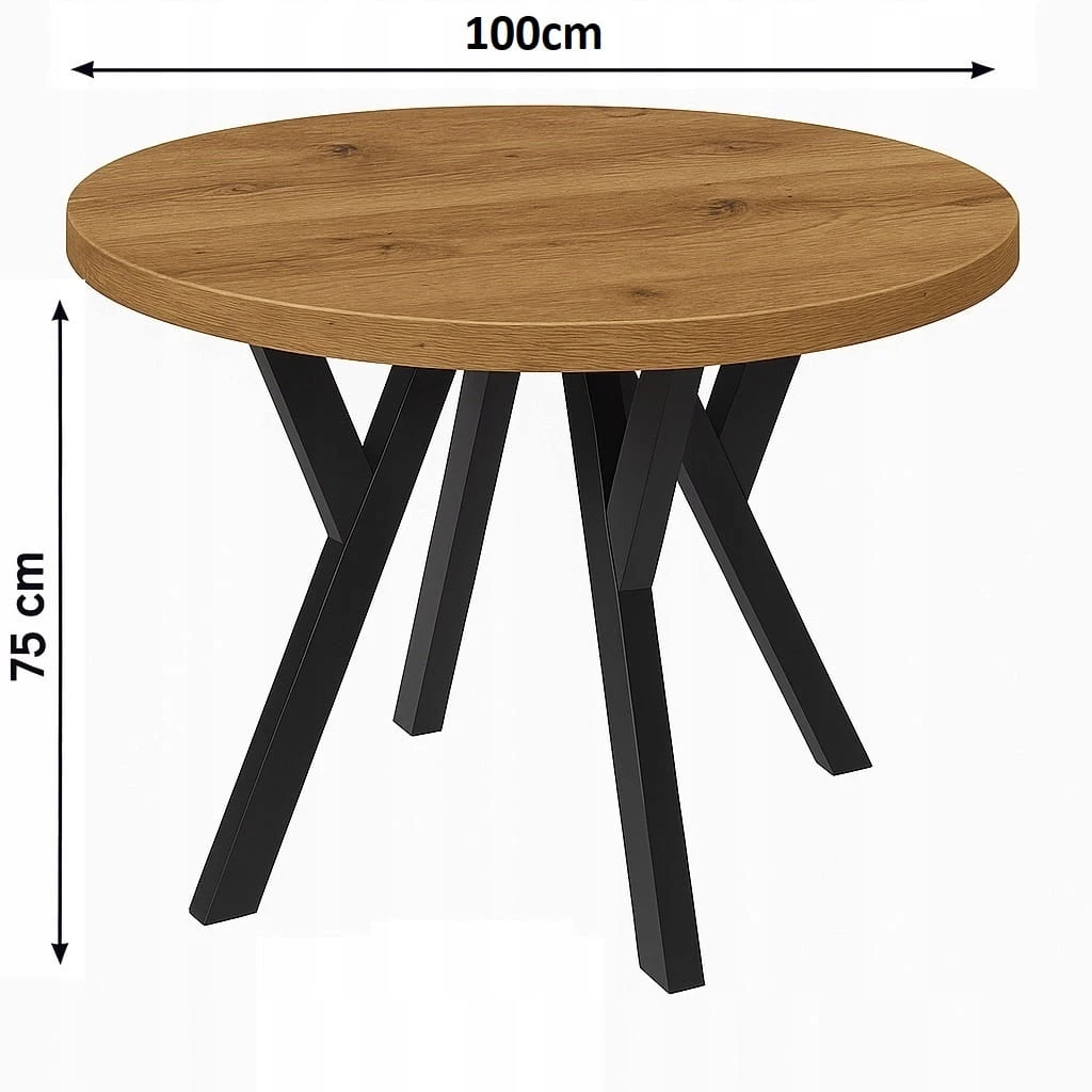 Praktyczny stół w stylu LOFT INDUSTRIAL o średnicy Ø 100cm. Blat wykonany z płyty laminowanej o grubości 36mm. Masywne metalowe nogi z profilu o przekroju 40mm x 60mm w kolorze czarnym malowana proszkowo zapewnia doskonałą stabilność stołu.