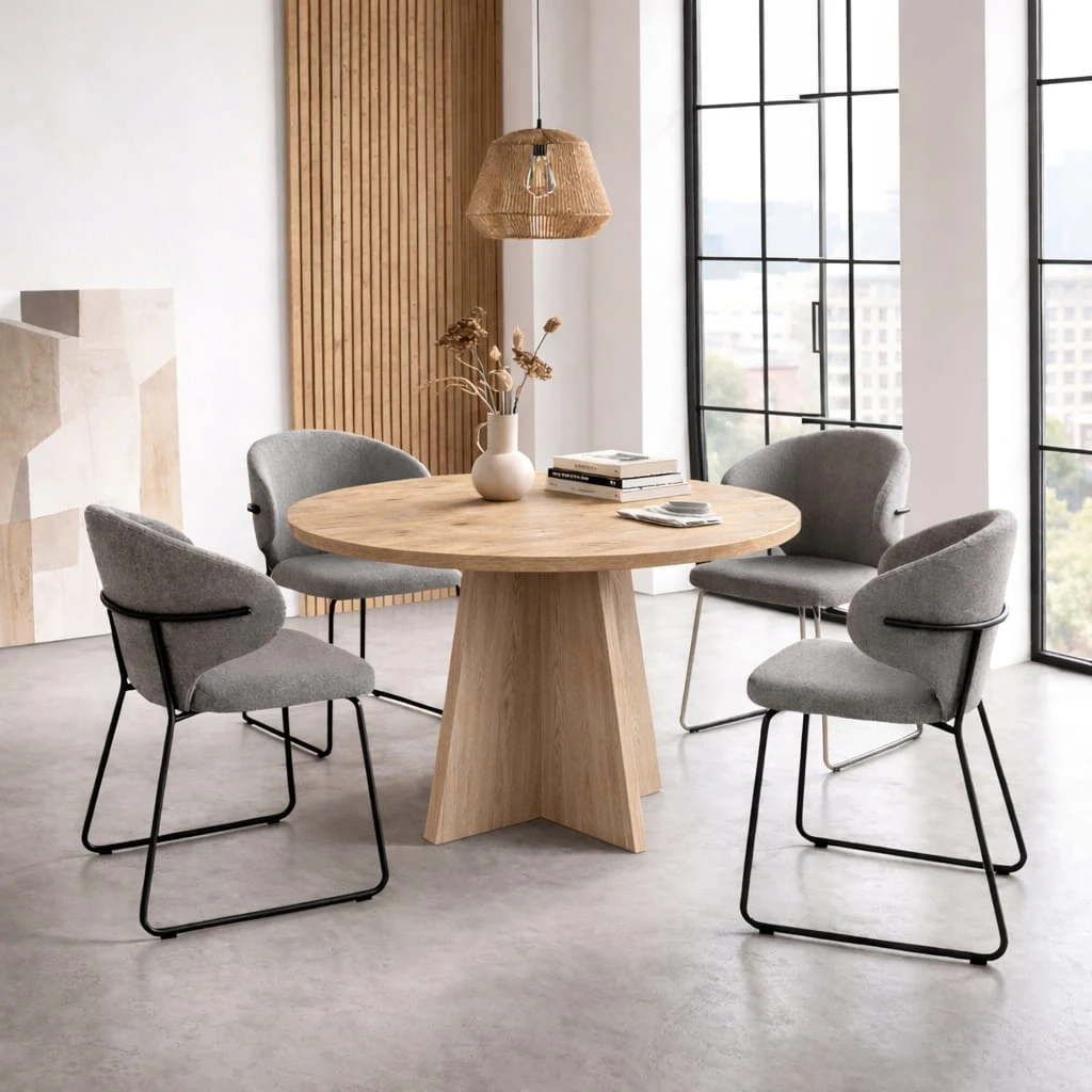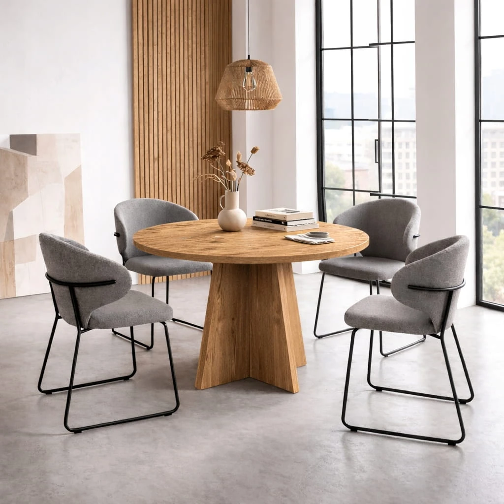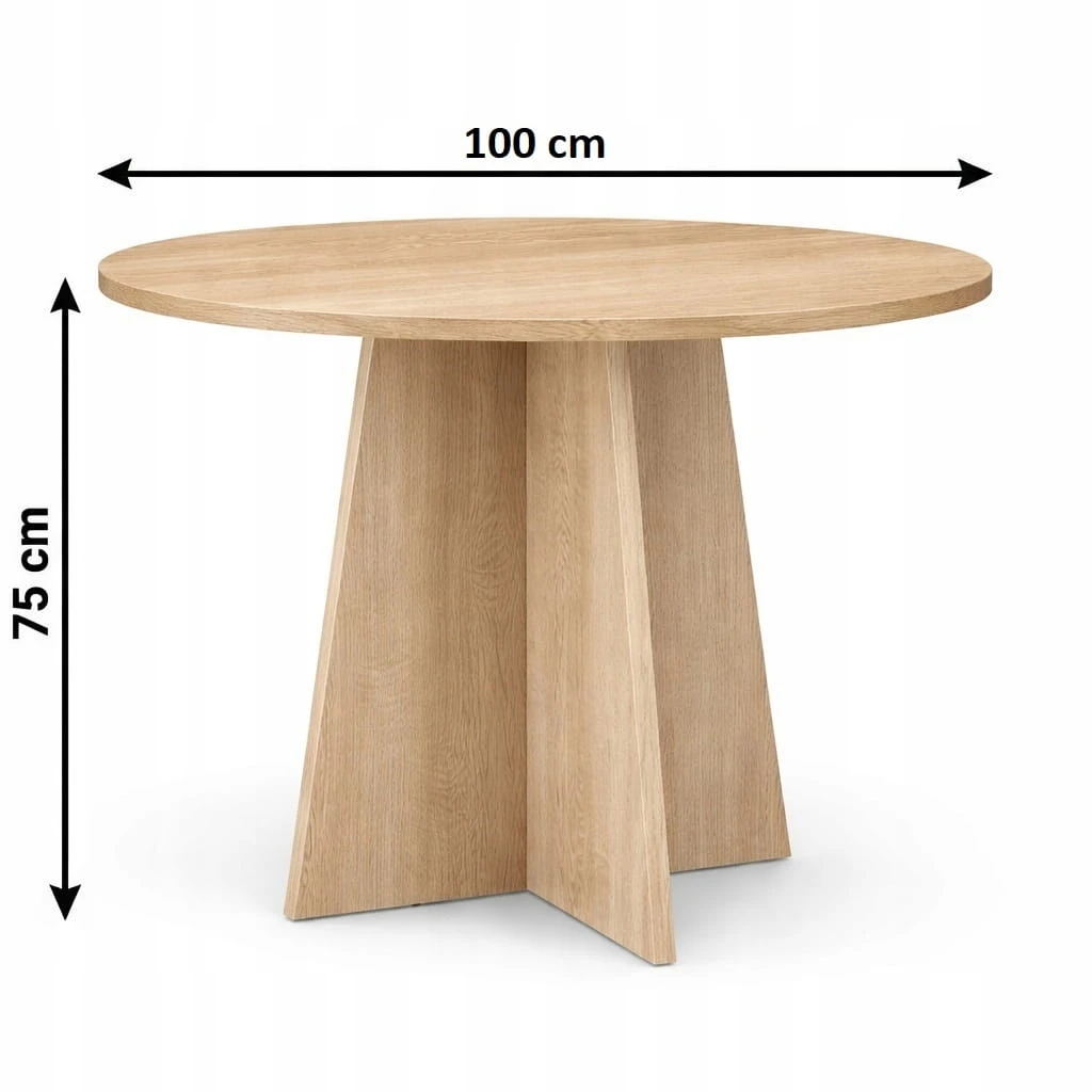 Stół w kształcie piramidy o średnicy fi 100cm w kolorze Dąb Sonoma wykonany z płyty laminowanej o grubości 18mm. Kompaktowa średnica sprawia, że idealnie sprawdza się w kuchni, jadalni lub salonie, nie przytłaczając przestrzeni.