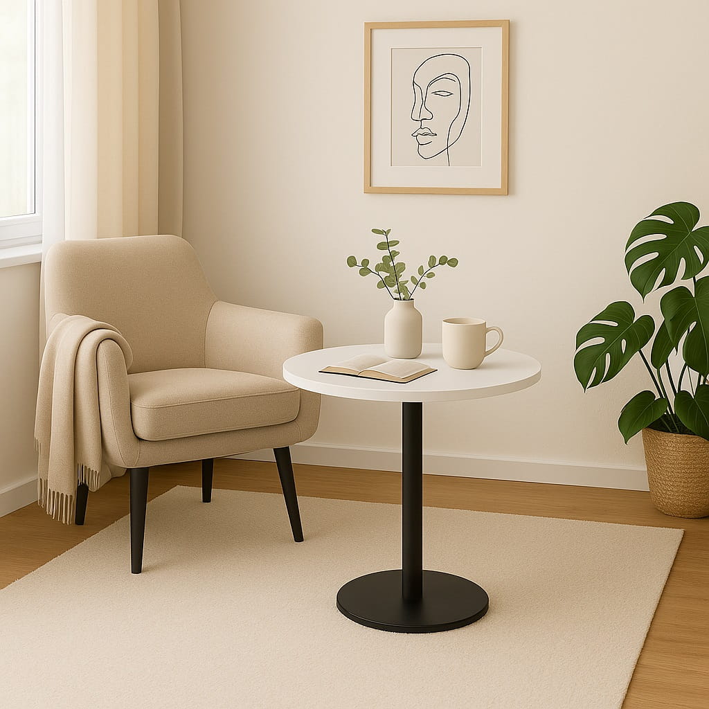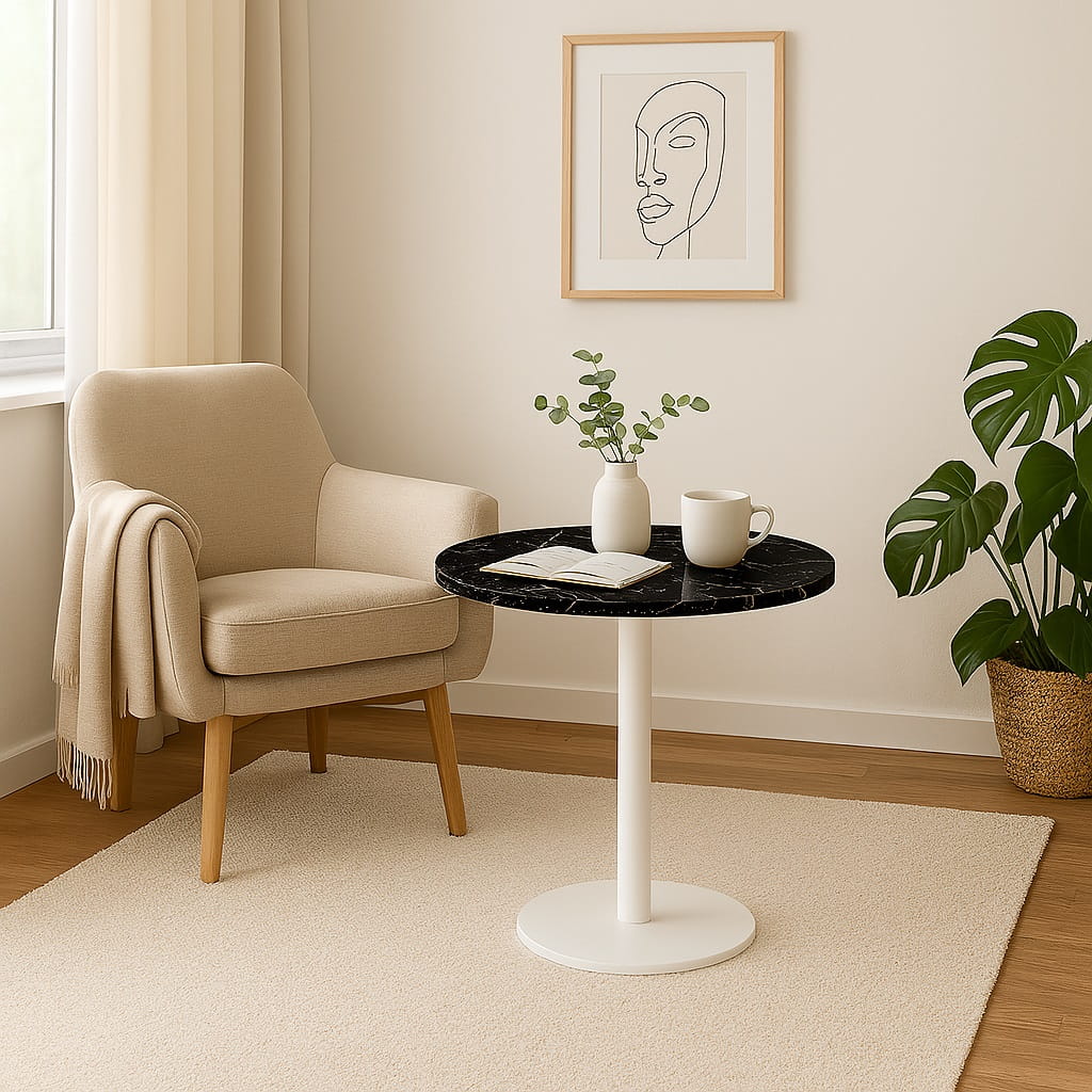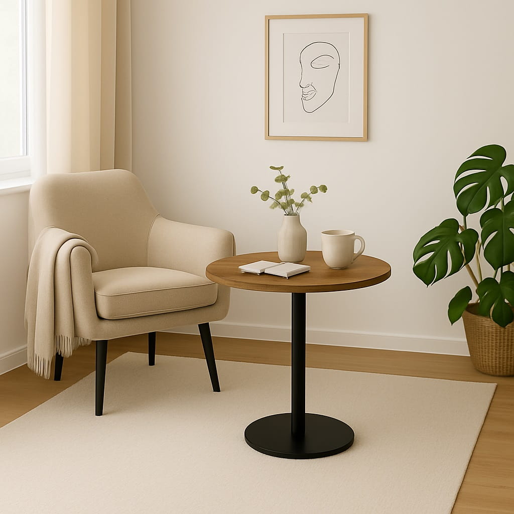 Model świetnie sprawdza się jako mały stolik kawowy 50 cm do salonu, oferując wygodną przestrzeń na kawę, książkę czy dekoracje. Okrągły blat nadaje wnętrzu lekkości i ułatwia swobodne poruszanie się wokół mebla.