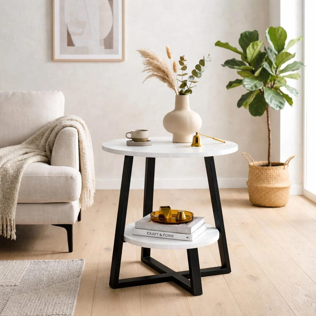 Jako mały stolik okrągły do salonu pozwala wygodnie odłożyć filiżankę kawy, książkę czy pilot, nie zajmując przy tym dużej przestrzeni. To również stolik 50 cm do małego mieszkania, który świetnie odnajdzie się w kawalerce lub w przestrzeni typu studio.