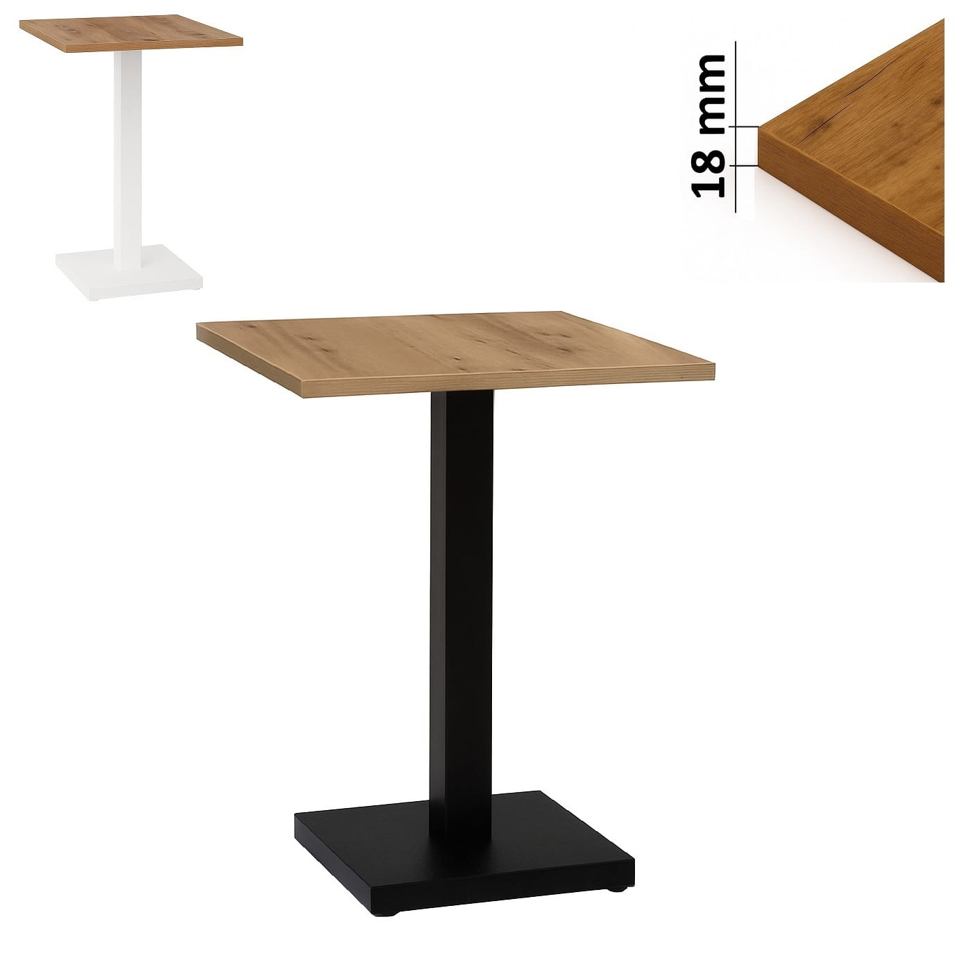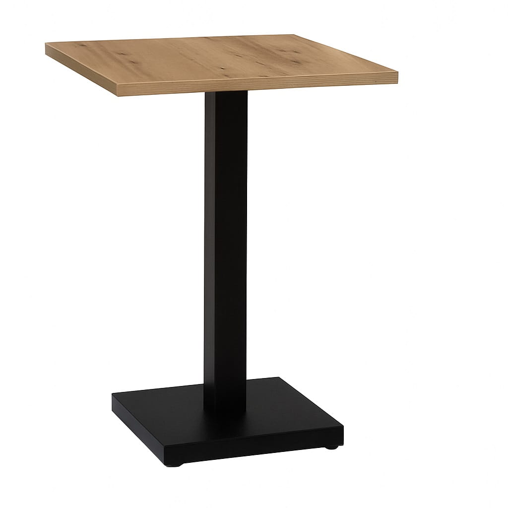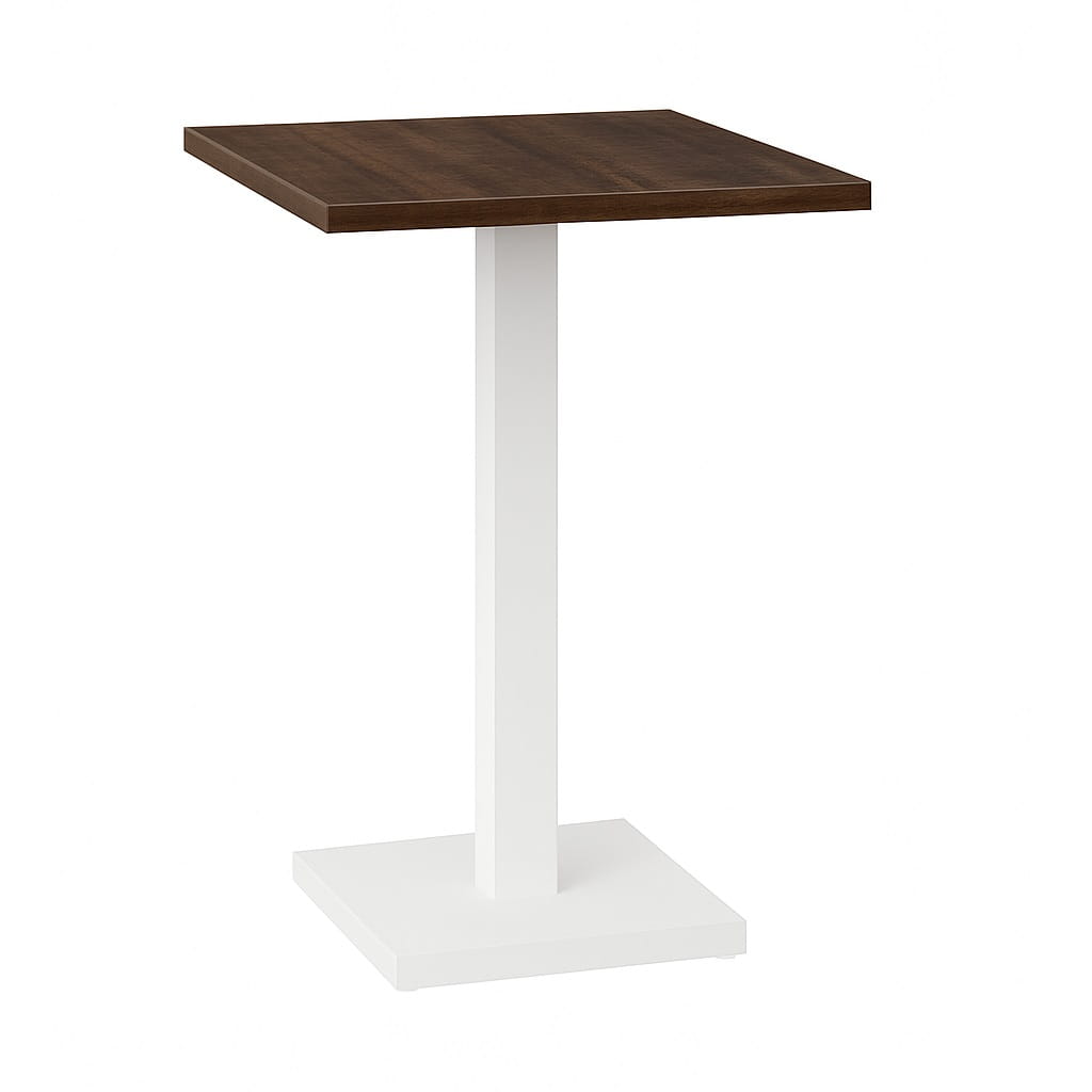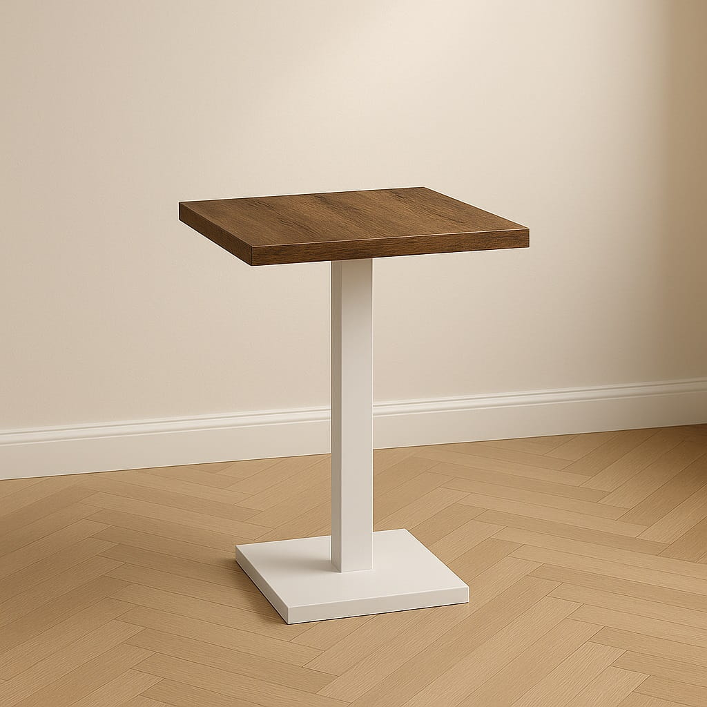 Ten stolik okolicznościowy loft 50x50 cm wykonany jest z płyty laminowanej o grubości 18 mm i podwyższonej odporności na zarysowania. Obrzeża zabezpieczone okleiną PCV 0,8 mm chronią krawędzie przed uszkodzeniami mechanicznymi i codziennym użytkowaniem.