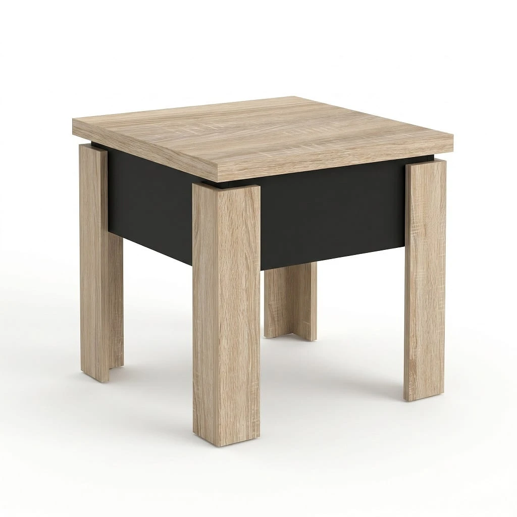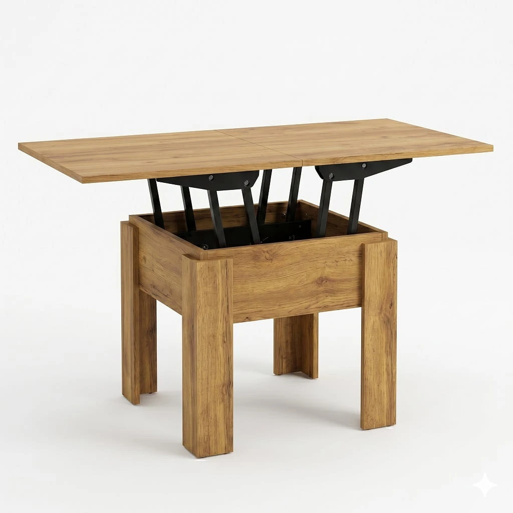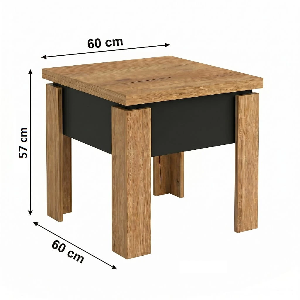 Dzięki szerokości 60 cm model idealnie sprawdzi się jako mały stolik kawowy kwadratowy, który można ustawić bezpośrednio przy sofie lub narożniku, optymalnie wykorzystując dostępne miejsce. Po rozłożeniu i podniesieniu do wysokości 75cm powstaje kompaktowa ława do małego salonu o wymiarach 60cm x 120cm, która nie przytłacza wnętrza, a jednocześnie zapewnia stabilną i wygodną przestrzeń na filiżankę kawy, książkę czy dekoracje.