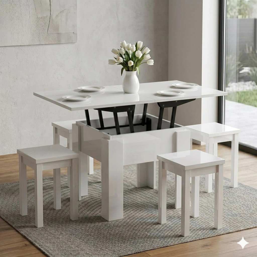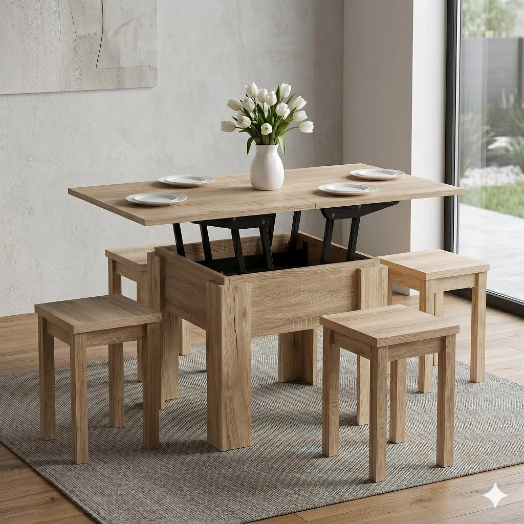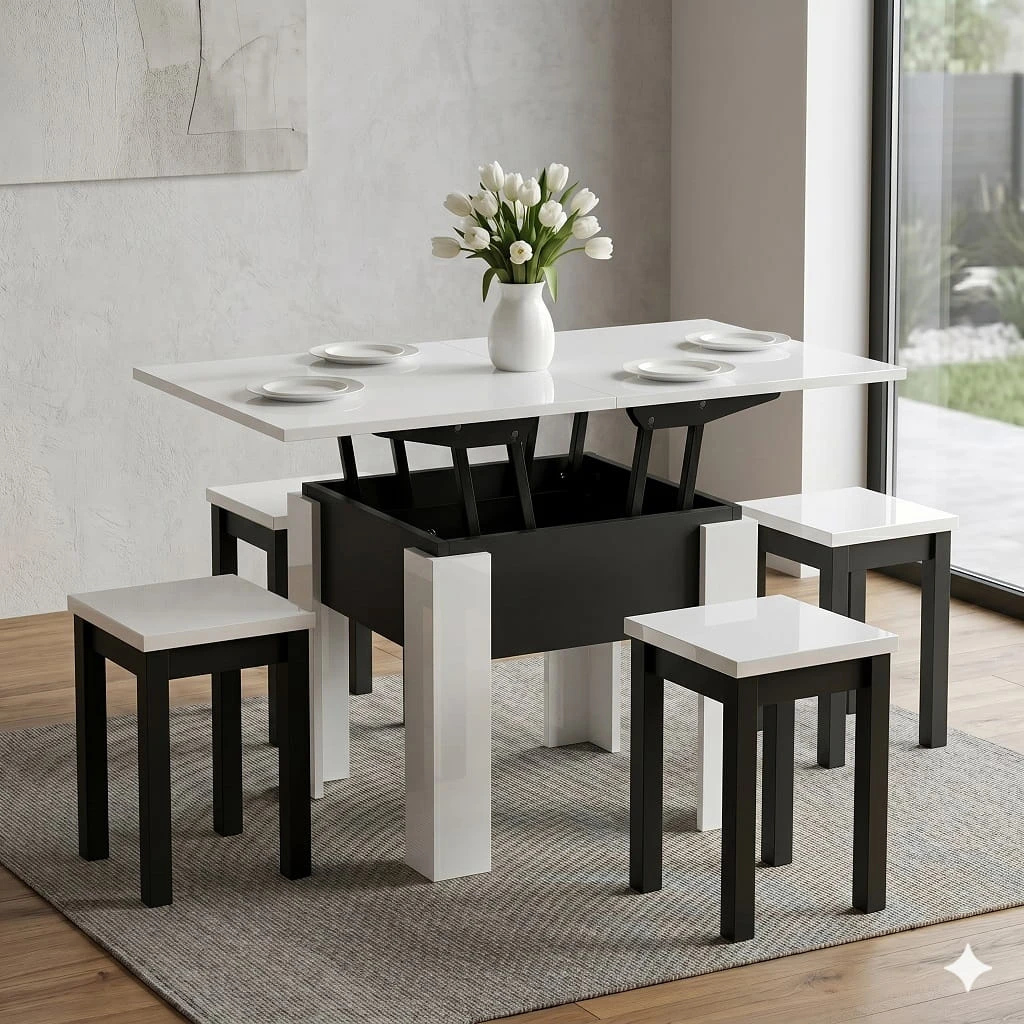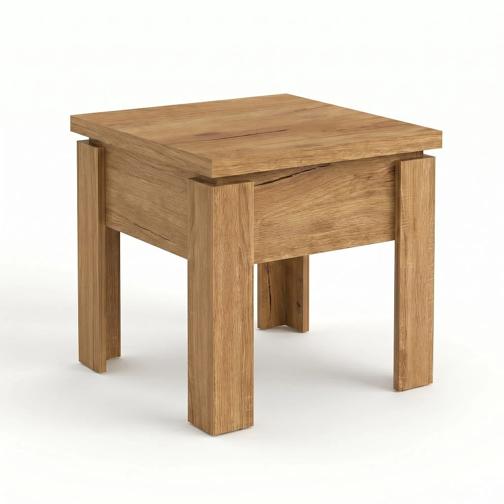 Dzięki szerokości 60 cm model idealnie sprawdzi się jako mały stolik kawowy kwadratowy, który można ustawić bezpośrednio przy sofie lub narożniku, optymalnie wykorzystując dostępne miejsce. Po rozłożeniu i podniesieniu do wysokości 75cm powstaje kompaktowa ława do małego salonu o wymiarach 60cm x 120cm, która nie przytłacza wnętrza, a jednocześnie zapewnia stabilną i wygodną przestrzeń na filiżankę kawy, książkę czy dekoracje.