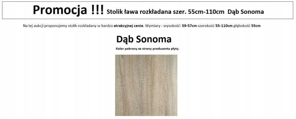 Promocja !!! Stolik ława rozkładana szer. 55-110 cm Dąb Sonoma