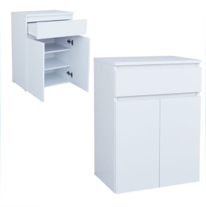Szafka została wyposażona w jedną pojemną szufladę oraz dwoje drzwiczek. szafka łazienkowa z szufladą i półkami zapewnia wygodne przechowywanie różnych przedmiotów i ułatwia utrzymanie porządku w łazience.
