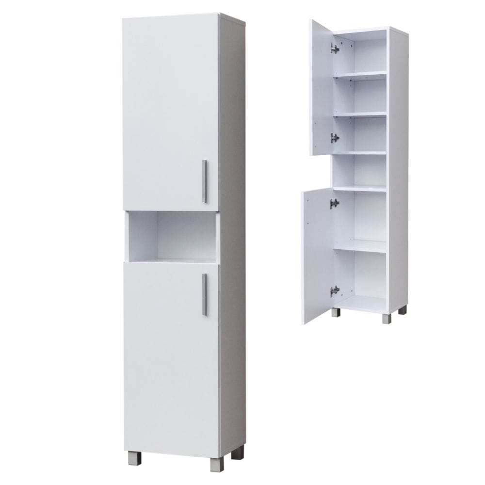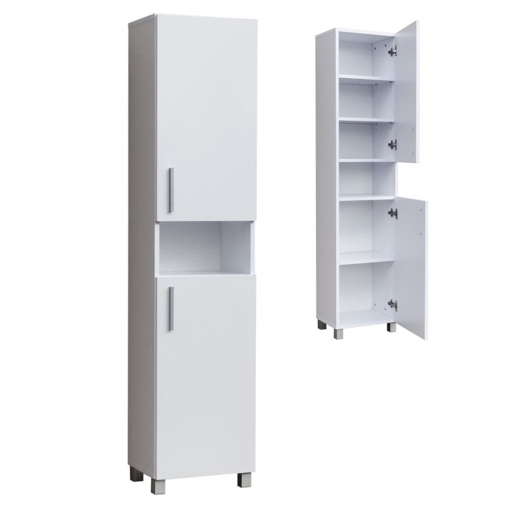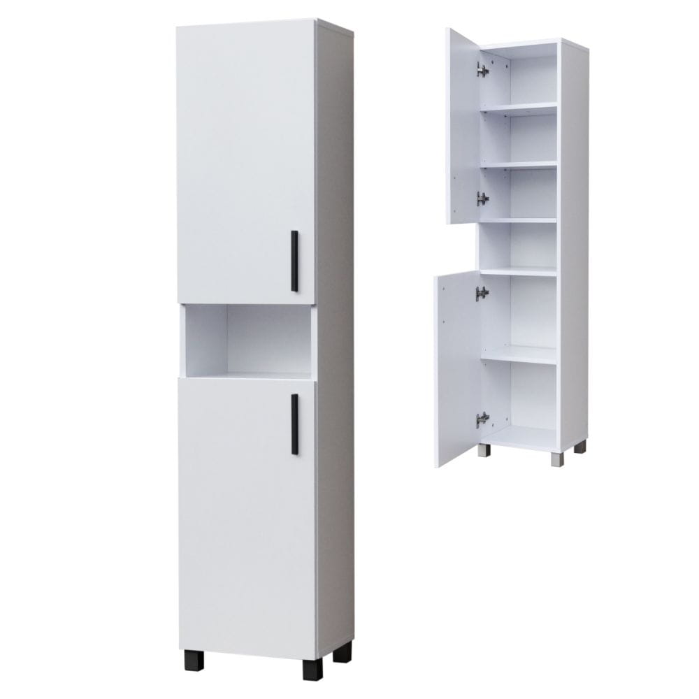 Pomiędzy drzwiczkami znajduje się praktyczna otwarta półka, która ułatwia szybki dostęp do najczęściej używanych przedmiotów. To wygodne miejsce na kosmetyki, zapas papieru, perfumy lub dekoracyjne dodatki, które dopełnią aranżację wnętrza.