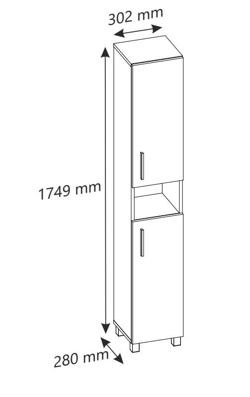 Szafka została wyposażona w dwoje drzwiczek, za którymi znajduje się pięć pojemnych półek. W dolnej części umieszczono dwie większe półki przeznaczone na wyższe lub większe przedmioty, natomiast w górnej części znajdują się trzy mniejsze półki idealne na kosmetyki, zapasy środków higienicznych i drobne akcesoria.