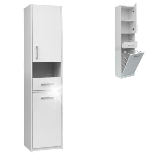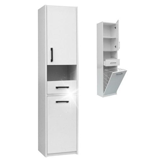 Nowoczesna szafka łazienkowa stojąca z koszem na bieliznę łączy kompaktowy rozmiar, dużą funkcjonalność oraz estetyczny design, dzięki czemu idealnie sprawdzi się w każdej łazience.