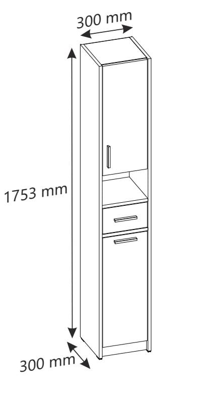 Górna część szafki skrywa dwie pojemne półki ukryte za drzwiczkami, które idealnie nadają się do przechowywania kosmetyków, ręczników czy środków czystości. Pomiędzy nimi umieszczono wysuwaną szufladę oraz praktyczną półkę zewnętrzną, zapewniającą szybki dostęp do najczęściej używanych przedmiotów.