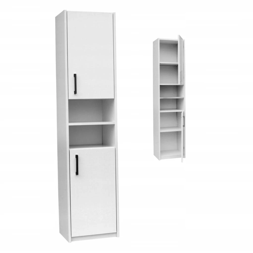 Pojemna szafka o szerokości 30cm. Posiada dwoje drzwiczek, za którymi znajdują się cztery pojemne półki oraz dwie odkryte półki. Dzięki dużej ilości pojemnych półek szafka jest w stanie pomieścić wiele akcesoriów używanych w łazience. Szafka oklejona obrzeżem PCV podwyższającą odporność na wilgoć. Doskonale sprawdzi się w każdej łazience.