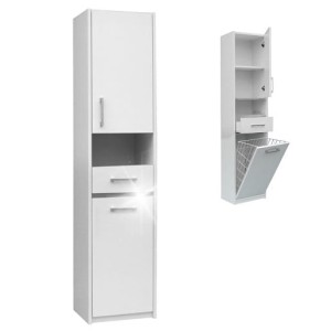 Dzięki przemyślanej konstrukcji mebel pozwala wygodnie uporządkować kosmetyki, ręczniki oraz środki czystości, a jednocześnie ukryć kosz na bieliznę. Nowoczesna forma sprawia, że szafka doskonale pasuje do współczesnych aranżacji łazienek.