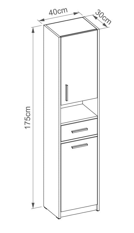 W górnej części mebla znajdują się dwoje drzwiczek, za którymi umieszczono dwie pojemne półki idealne na kosmetyki, ręczniki czy środki czystości. Pomiędzy drzwiczkami znajduje się praktyczna szuflada oraz zewnętrzna półka umożliwiająca szybki dostęp do najczęściej używanych akcesoriów.