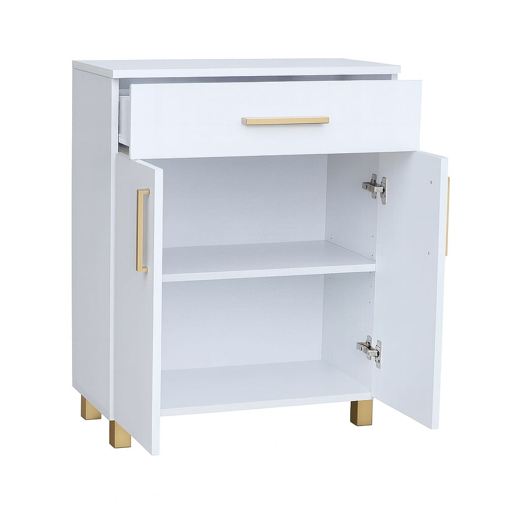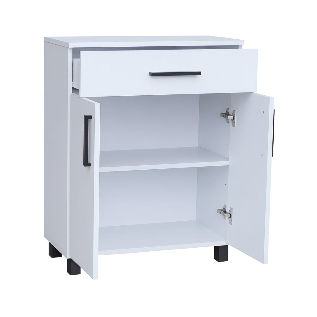 Wnętrze mebla obejmuje dwie pojemne półki ukryte za drzwiczkami oraz praktyczną szufladę, która zwiększa możliwości organizacyjne. Taki układ sprawia, że wszystkie potrzebne akcesoria można przechowywać w uporządkowany sposób.