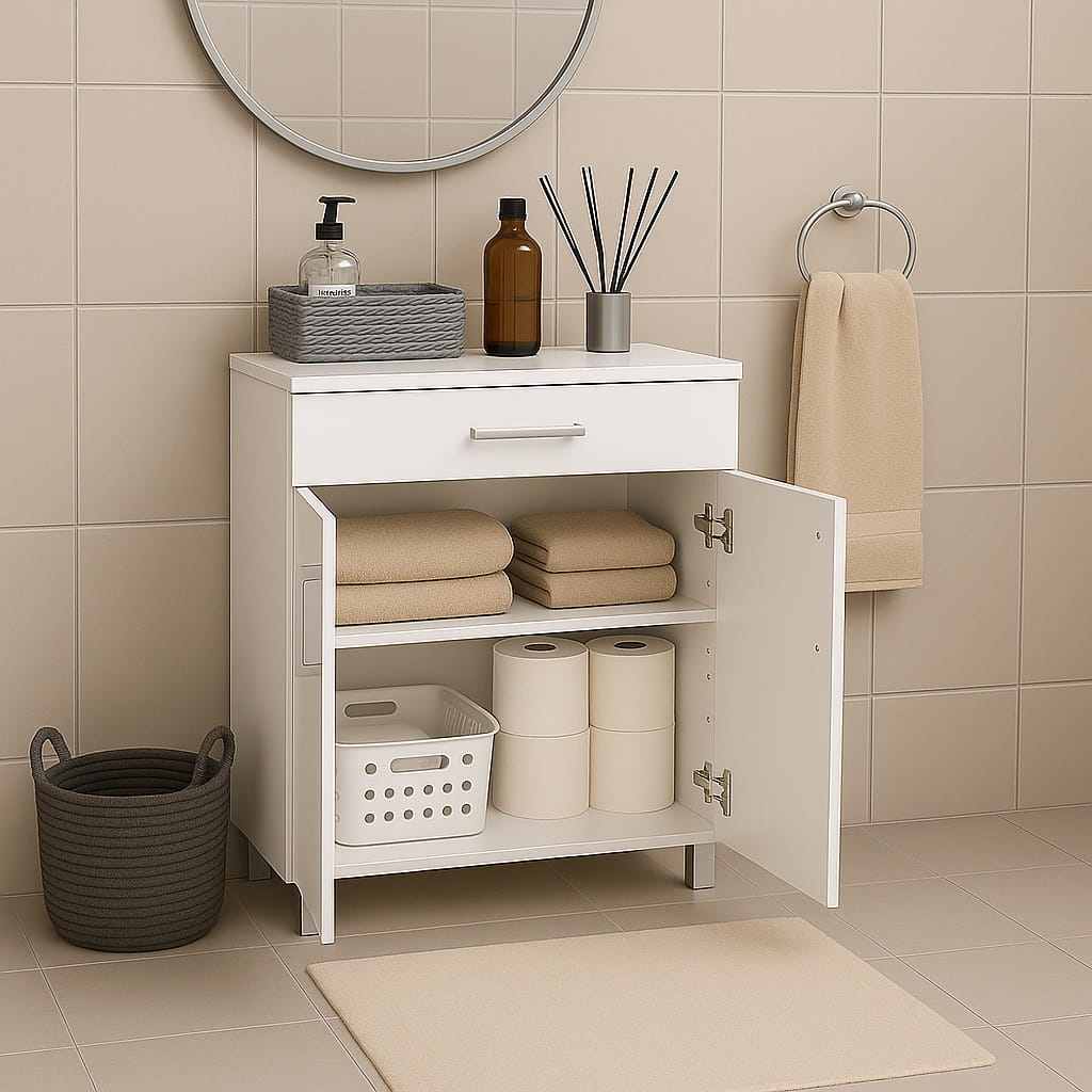 Pojemna szuflada doskonale sprawdza się do przechowywania kosmetyków, szczotek czy drobnych akcesoriów, natomiast przestrzeń za drzwiczkami z półkami pozwala przechowywać większe przedmioty, takie jak ręczniki czy zapasowe środki czystości.
