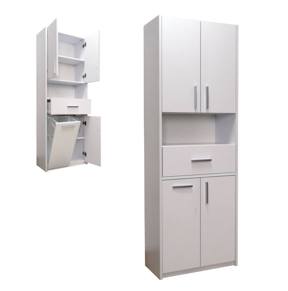 Dolna część szafki została wyposażona w uchylne drzwiczki z metalowym koszem na bieliznę. Dzięki temu szafka łazienkowa z koszem na bieliznę umożliwia dyskretne przechowywanie rzeczy przeznaczonych do prania, pomagając utrzymać porządek w łazience.