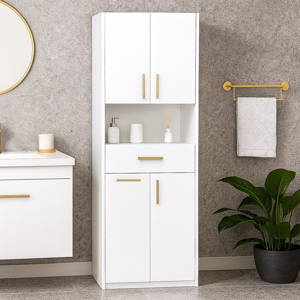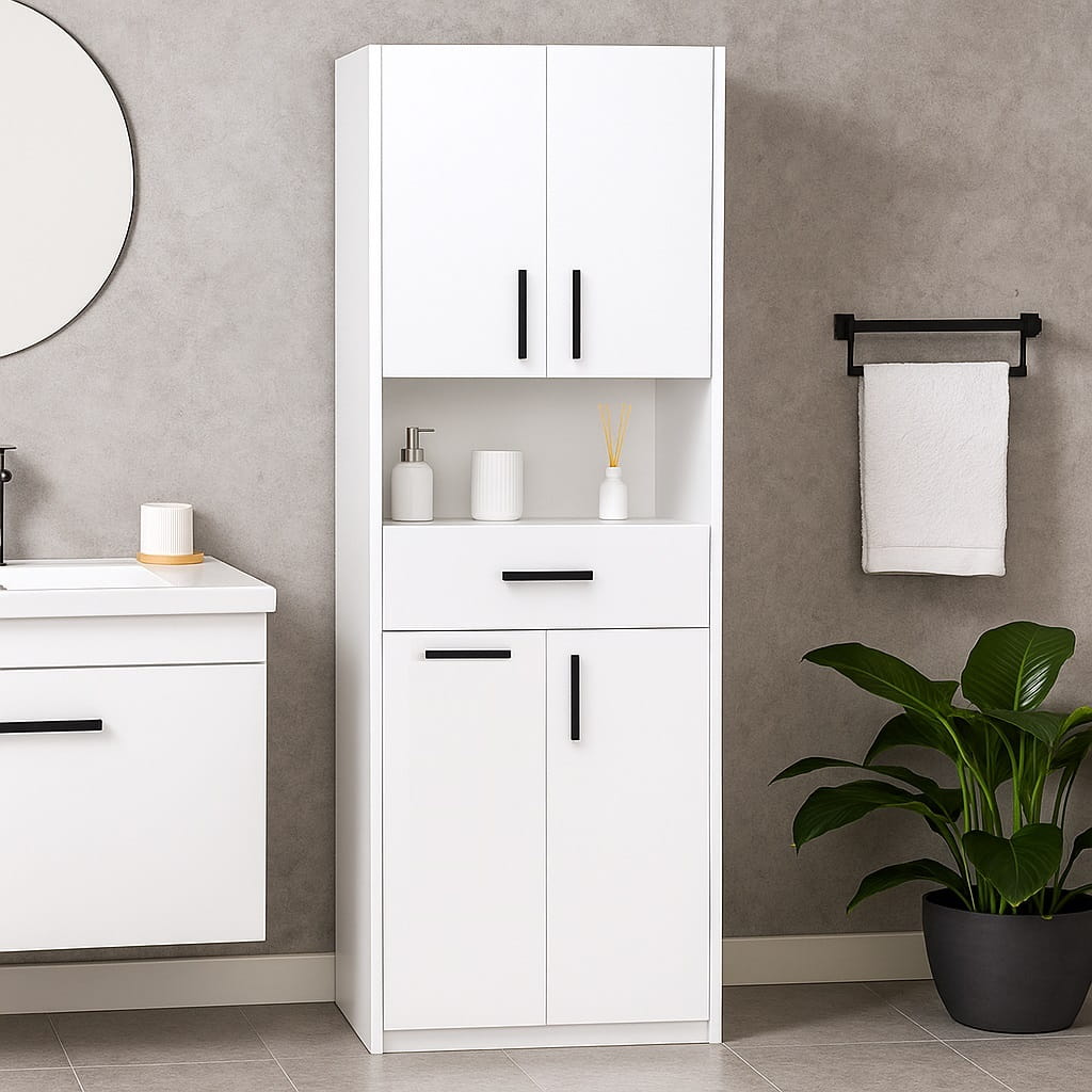 Dzięki temu szafka łazienkowa stojąca z półkami i szufladą umożliwia wygodne uporządkowanie zarówno kosmetyków, jak i ręczników czy innych akcesoriów łazienkowych.