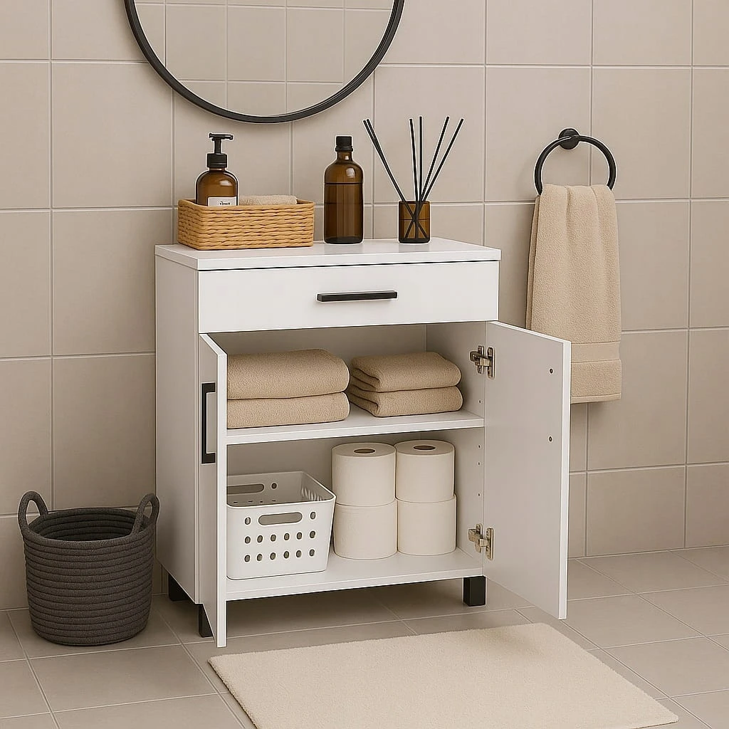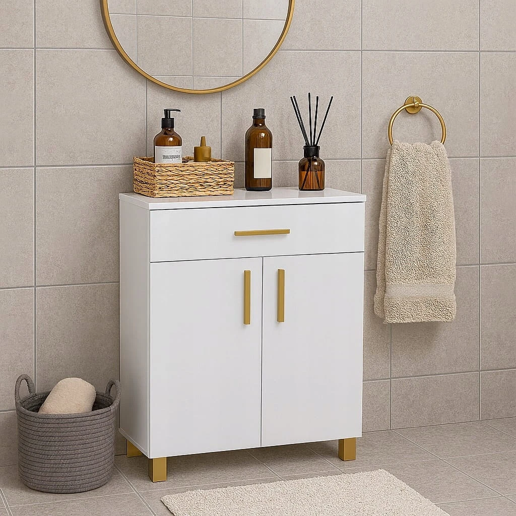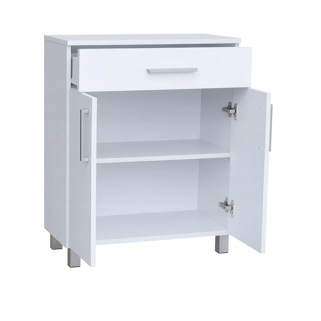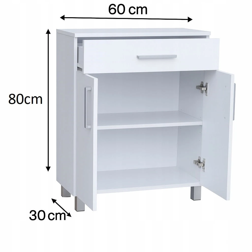 Model wyposażony jest w pojemną szufladę oraz dwoje drzwiczek, za którymi znajdują się dwie praktyczne półki idealne na kosmetyki, ręczniki i akcesoria łazienkowe.