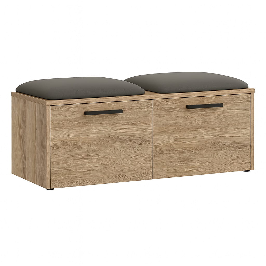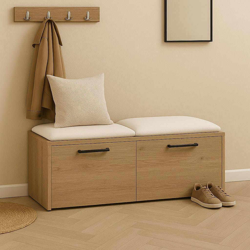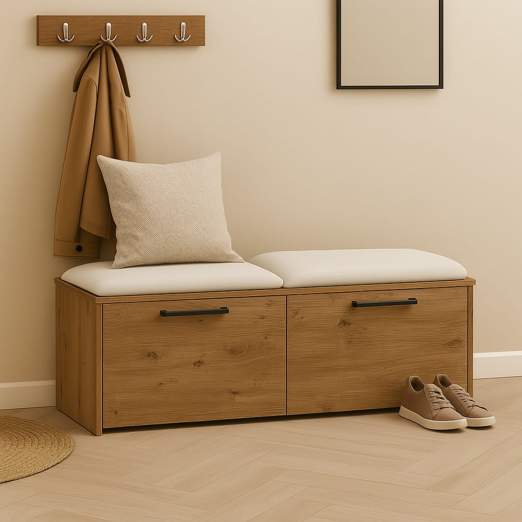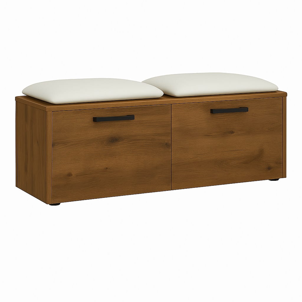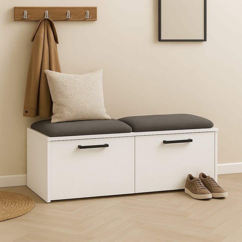 Miękkie siedzisko wykonane z pianki tapicerskiej zapewnia wygodę podczas zakładania lub zdejmowania obuwia. Dzięki temu szafka na buty z siedziskiem do przedpokoju staje się praktycznym elementem wyposażenia, który znacząco podnosi komfort korzystania z przestrzeni wejściowej.