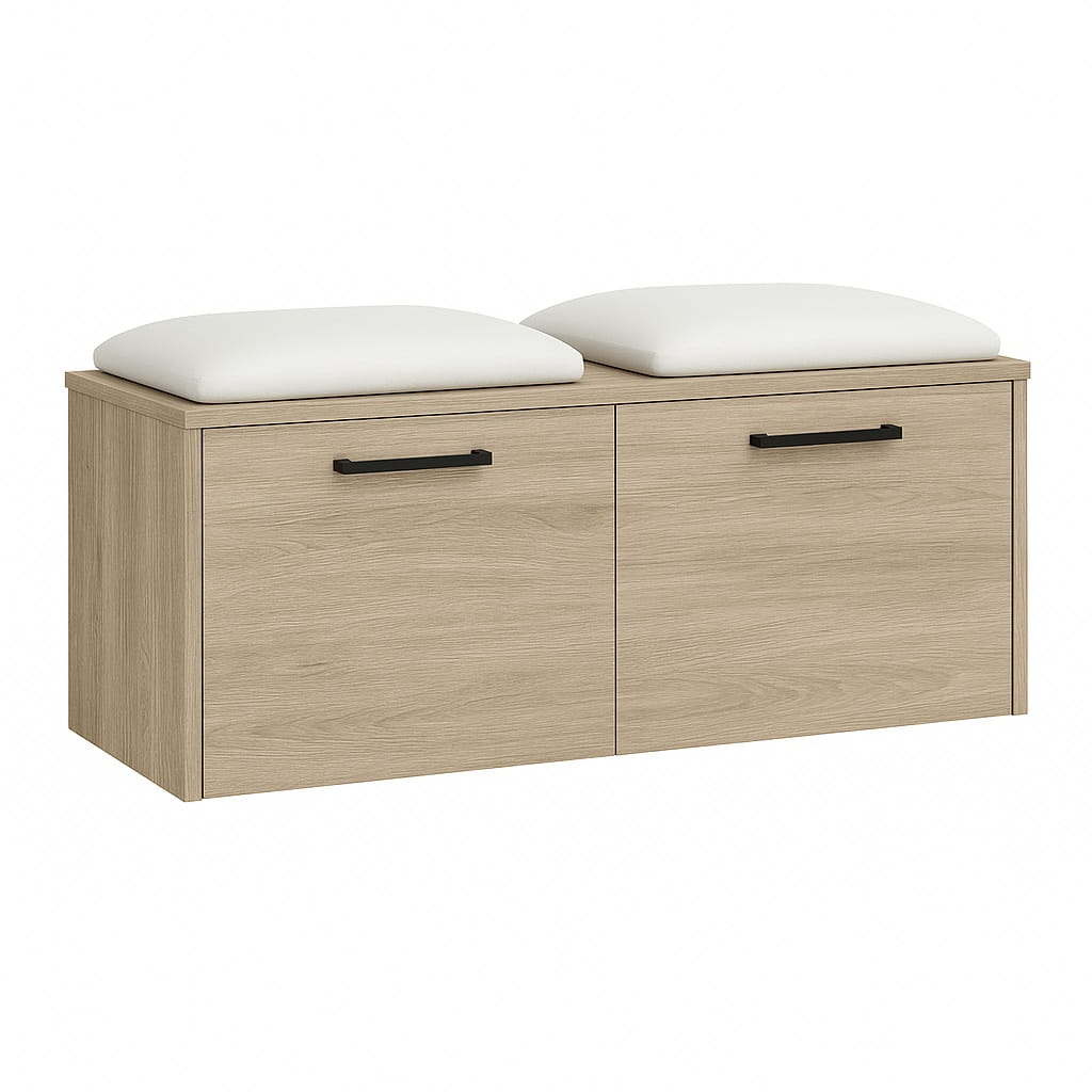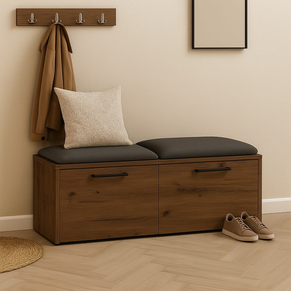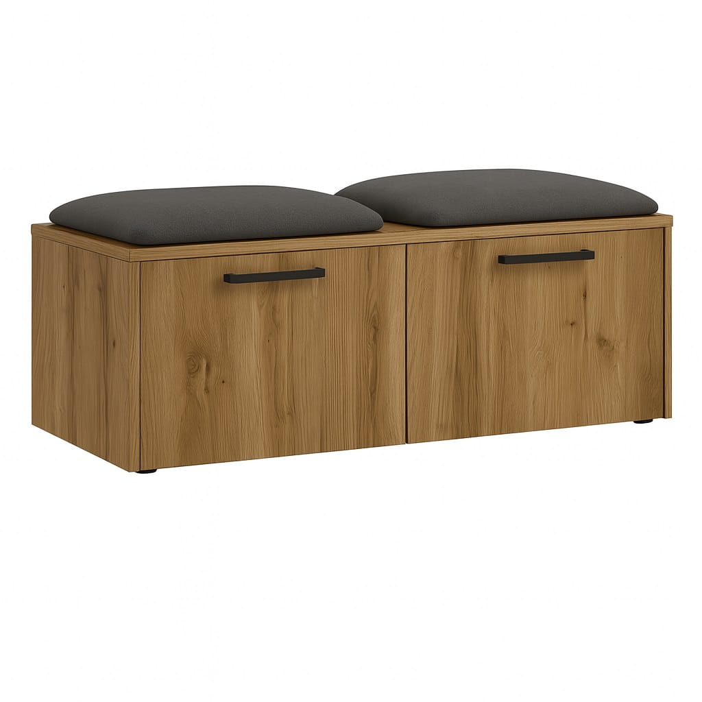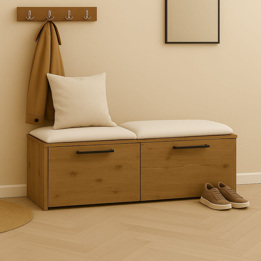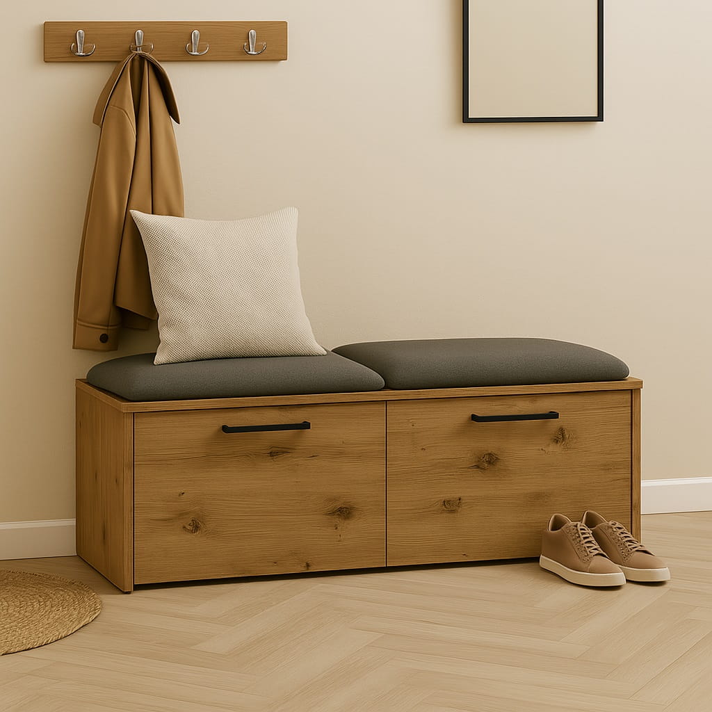 Miękkie siedzisko wykonane z pianki tapicerskiej zapewnia wygodę podczas zakładania lub zdejmowania obuwia. Dzięki temu szafka na buty z siedziskiem do przedpokoju staje się praktycznym elementem wyposażenia, który znacząco podnosi komfort korzystania z przestrzeni wejściowej.