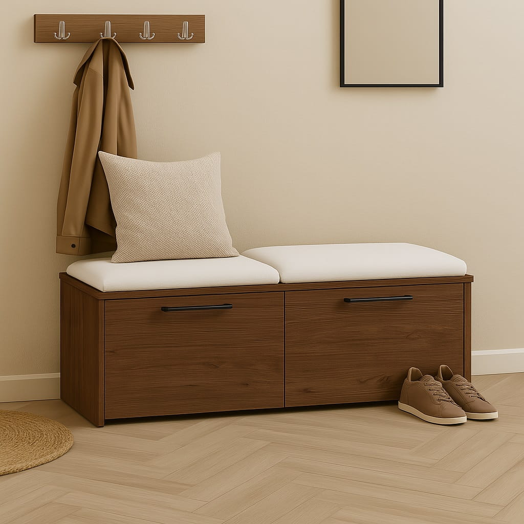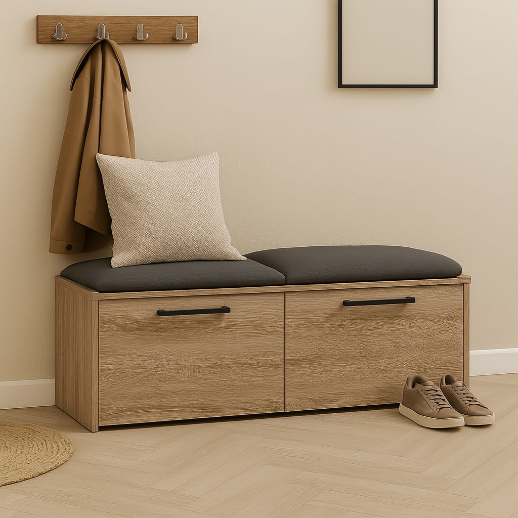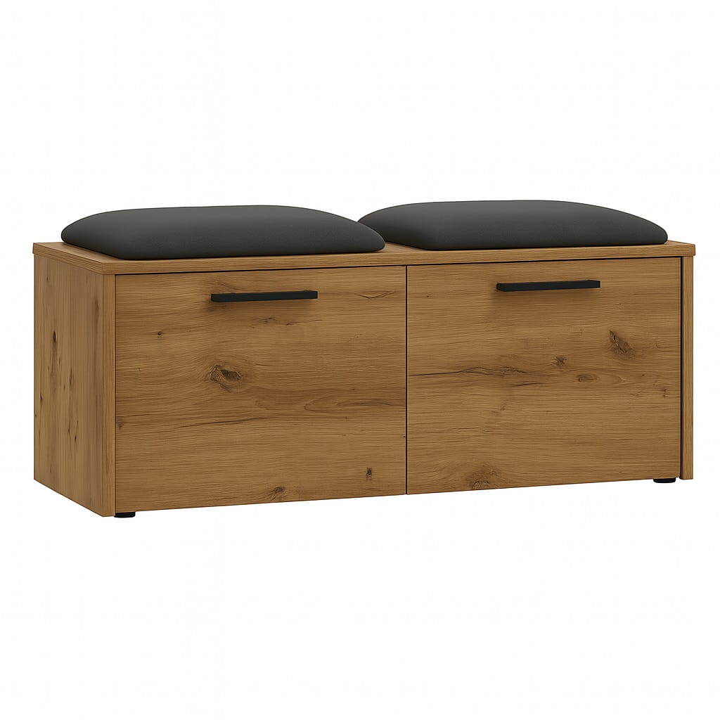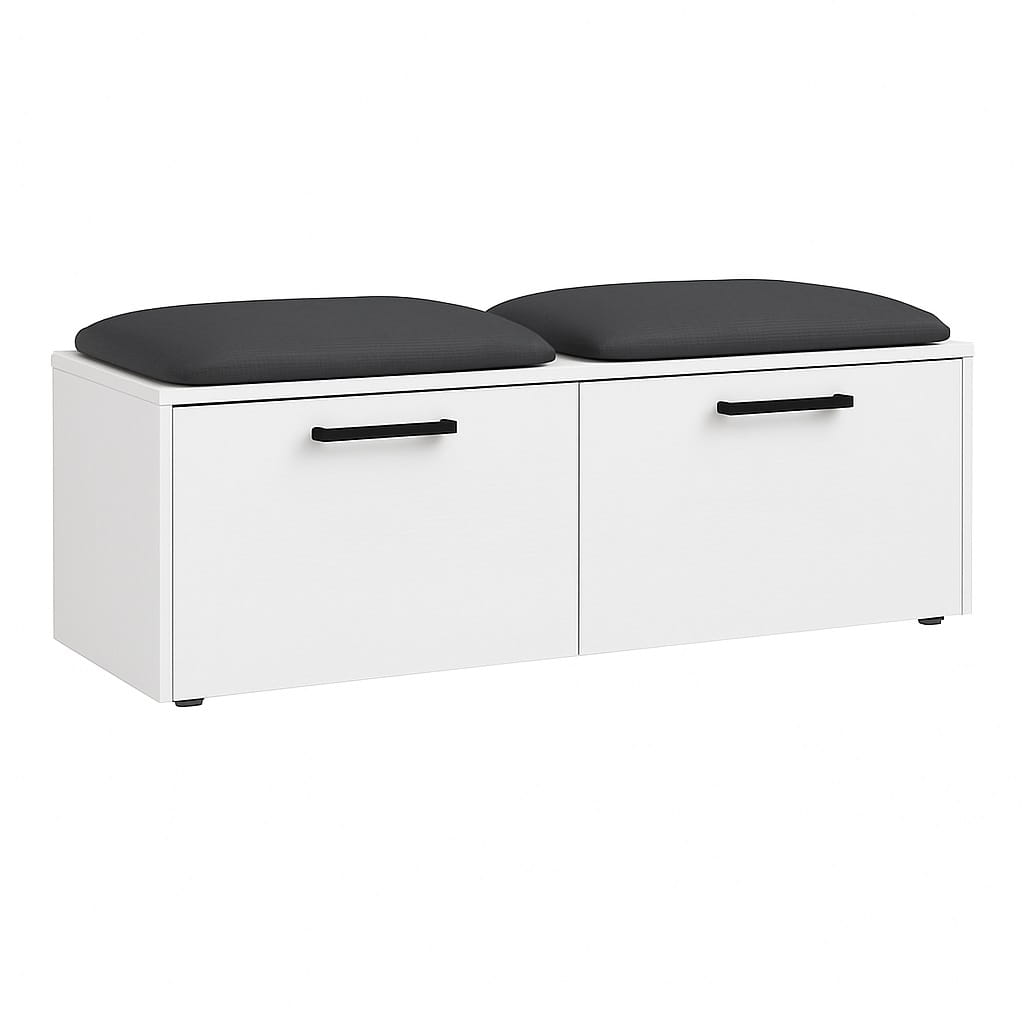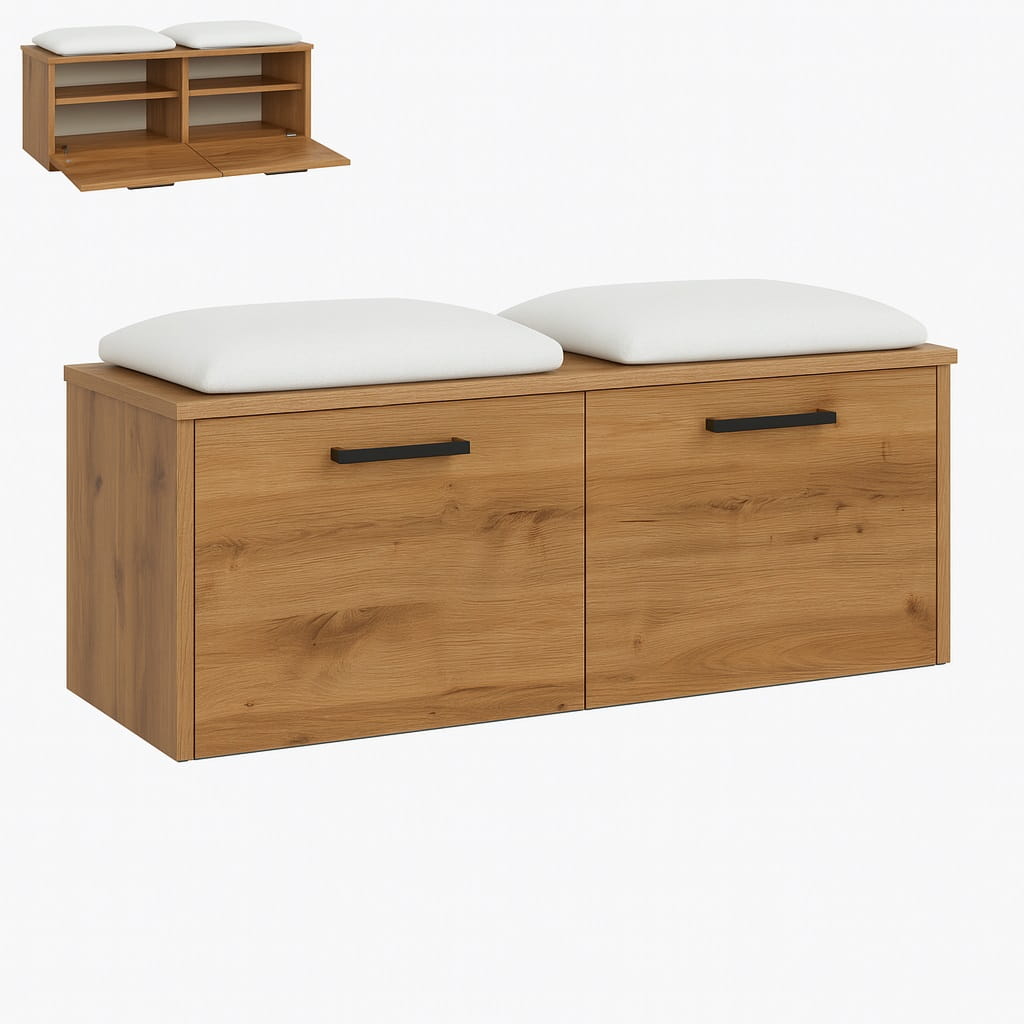 Miękkie siedzisko wykonane z pianki tapicerskiej zapewnia wygodę podczas zakładania lub zdejmowania obuwia. Dzięki temu szafka na buty z siedziskiem do przedpokoju staje się praktycznym elementem wyposażenia, który znacząco podnosi komfort korzystania z przestrzeni wejściowej.