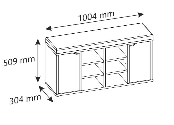 Korpus mebla wykonano z płyty laminowanej o grubości 18 mm o podwyższonej odporności na zarysowania. Dzięki temu nowoczesna szafka na buty z siedziskiem zachowuje estetyczny wygląd nawet przy intensywnym użytkowaniu.