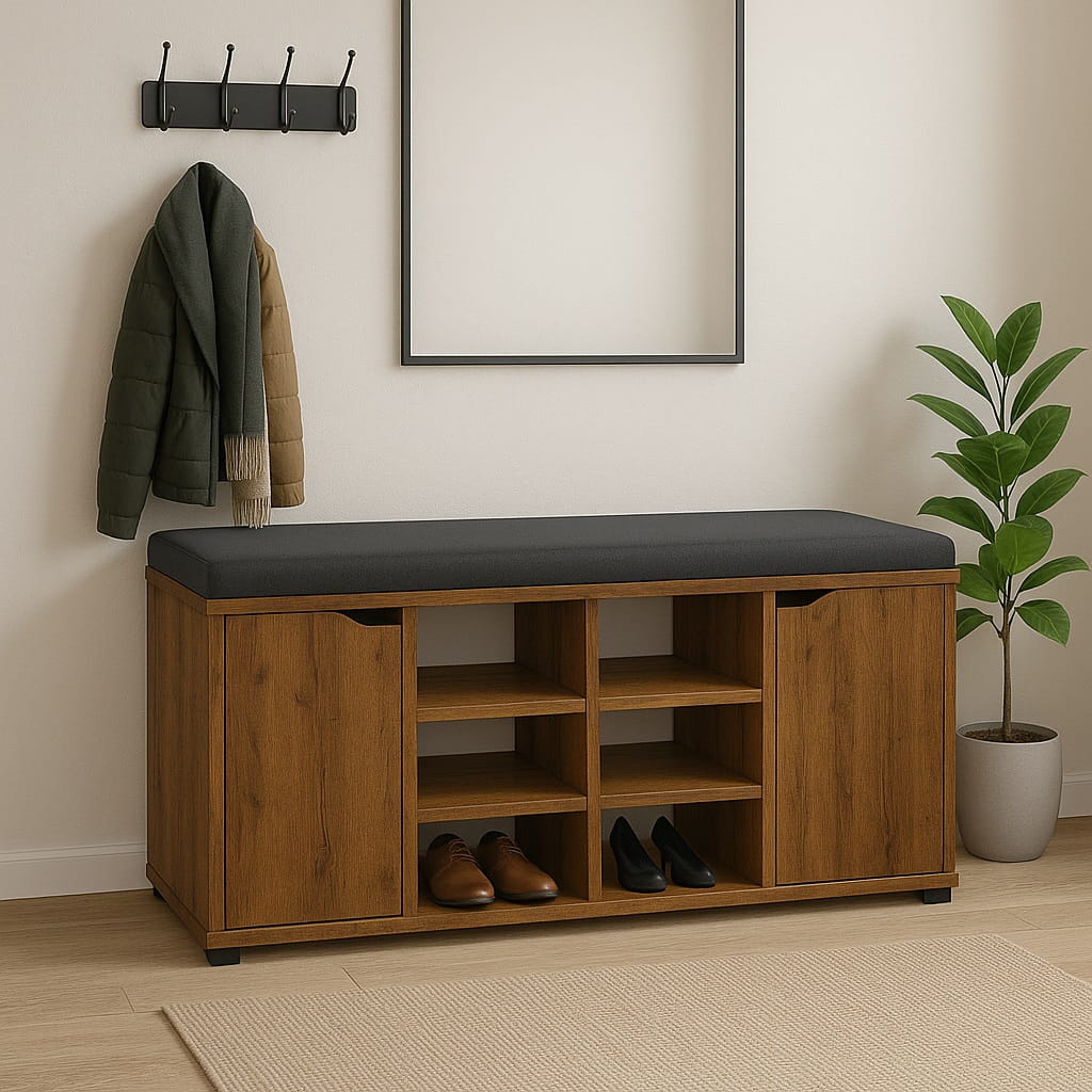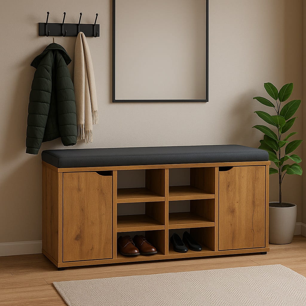 Miękkie siedzisko pokryte skajem lub wysokiej jakości tkaniną welurową nadaje meblowi elegancki charakter. Dzięki temu szafka na buty z siedziskiem do przedpokoju łączy funkcjonalność z estetycznym wyglądem wnętrza.
