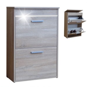 Szafka została wyposażona w dwie uchylne klapki z podwójną przegrodą na obuwie. Dzięki temu szafka na buty z uchylnymi klapkami pozwala przechowywać wiele par butów w uporządkowany sposób, zachowując jednocześnie kompaktowe wymiary mebla.