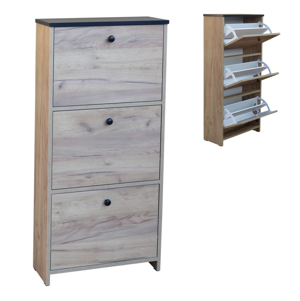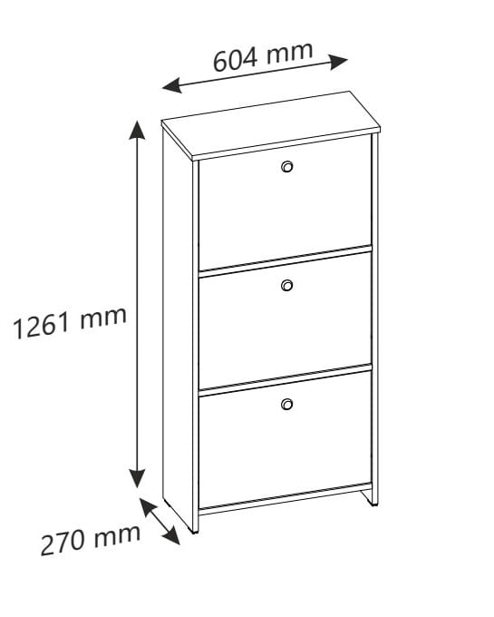 Szafka została wyposażona w trzy uchylne klapki, które umożliwiają wygodny dostęp do przechowywanego obuwia. szafka na buty z uchylnymi klapkami pozwala w estetyczny sposób ukryć buty i zachować porządek w przedpokoju.