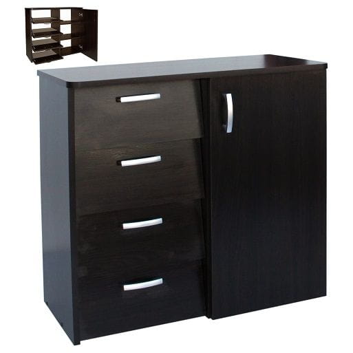 Dodatkowym atutem są boczne drzwiczki, za którymi znajdują się dwie półki. Dzięki temu szafka na buty z półkami umożliwia przechowywanie także akcesoriów do pielęgnacji obuwia lub innych drobnych przedmiotów potrzebnych w przedpokoju.