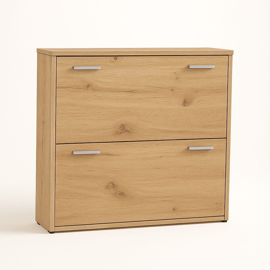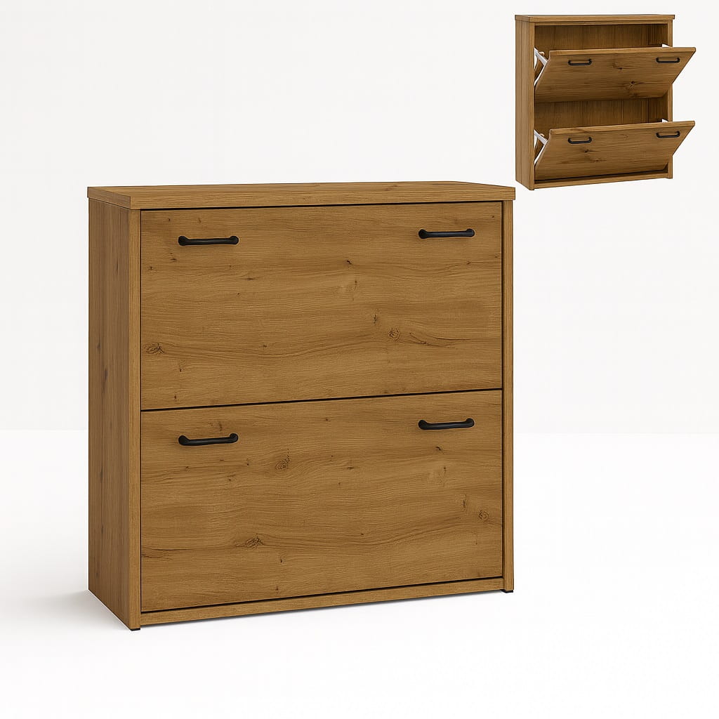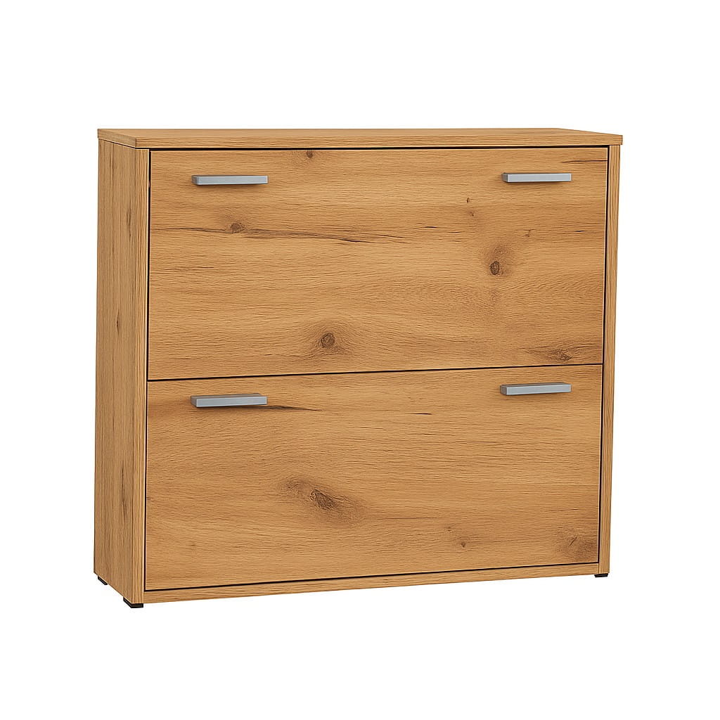 Szafka została wyposażona w dwie uchylne klapki z jedną przegrodą na buty, które ułatwiają szybki dostęp do przechowywanego obuwia. Dzięki temu szafka na buty z uchylnymi klapkami pozwala zachować porządek w przedpokoju i wygodnie organizować przestrzeń.